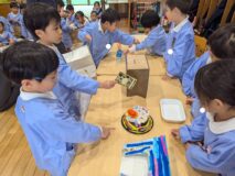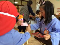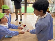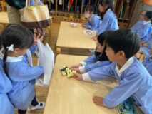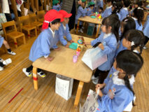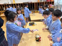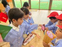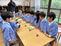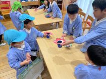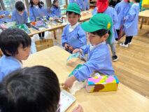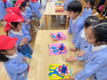 年長さんはおもちゃ屋さん♡ミャクミャクの輪投げ・ミャクミャクのびっくり箱・ミャクミャクのけん玉・車・コマ・ぬいぐるみを作ったよ!☆
