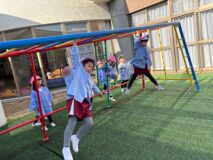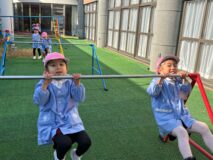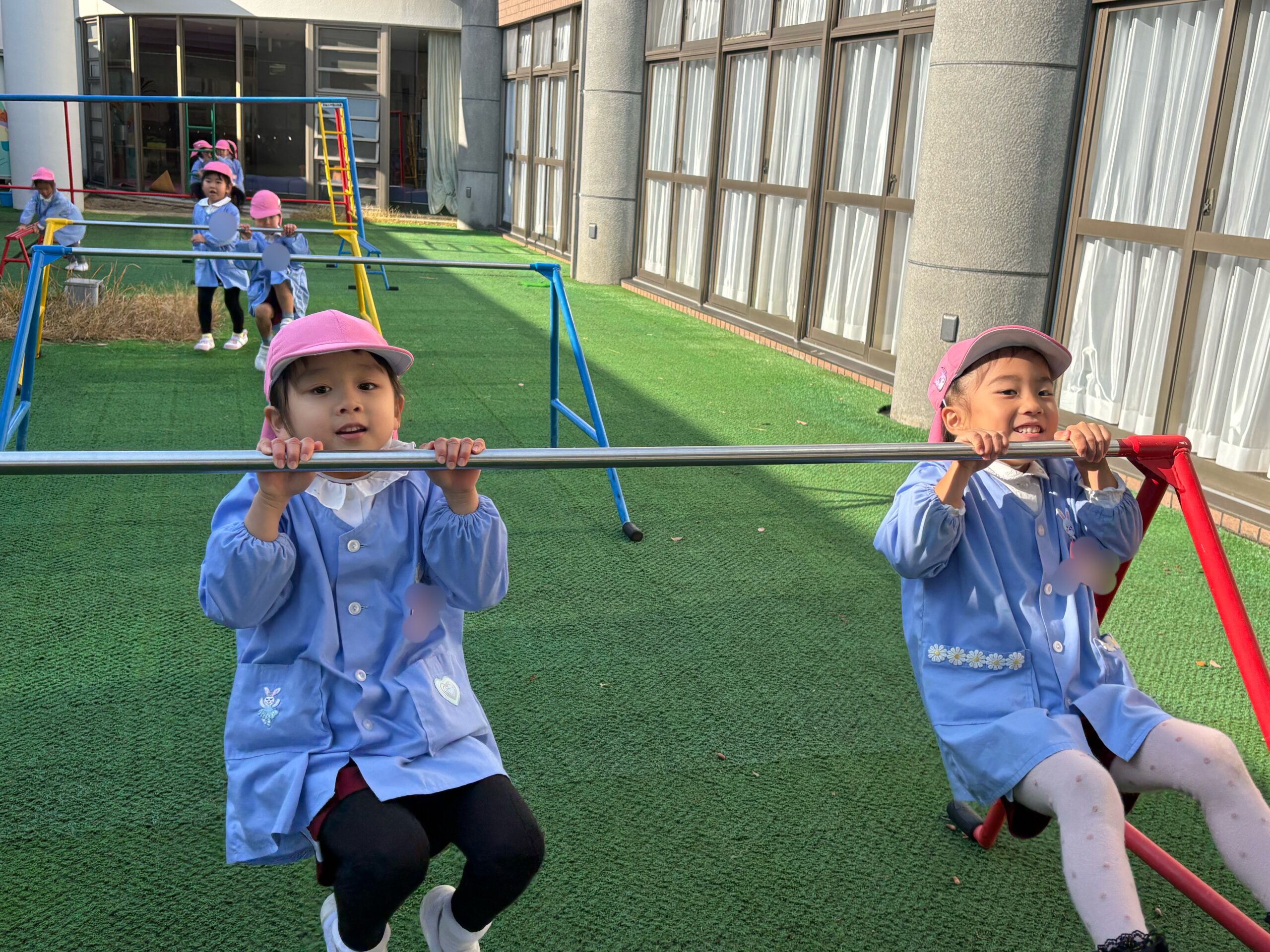 雲梯を最後まで進めるお友達は、最後は片手ぶら下がる技も加わったよ