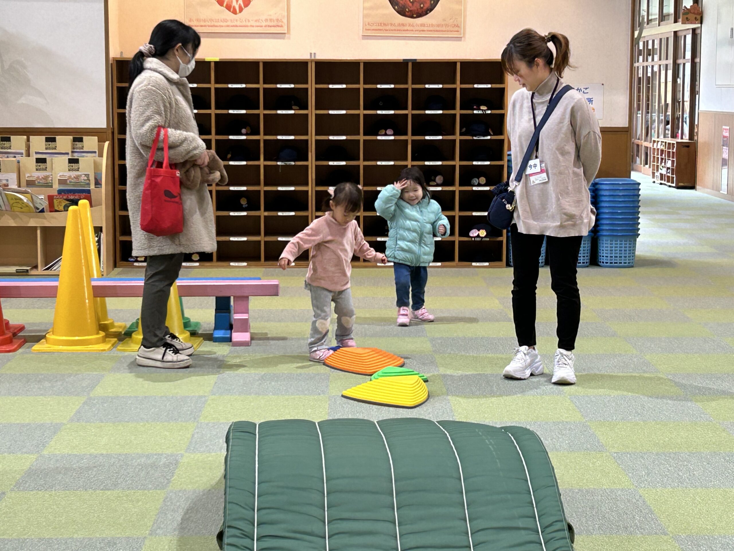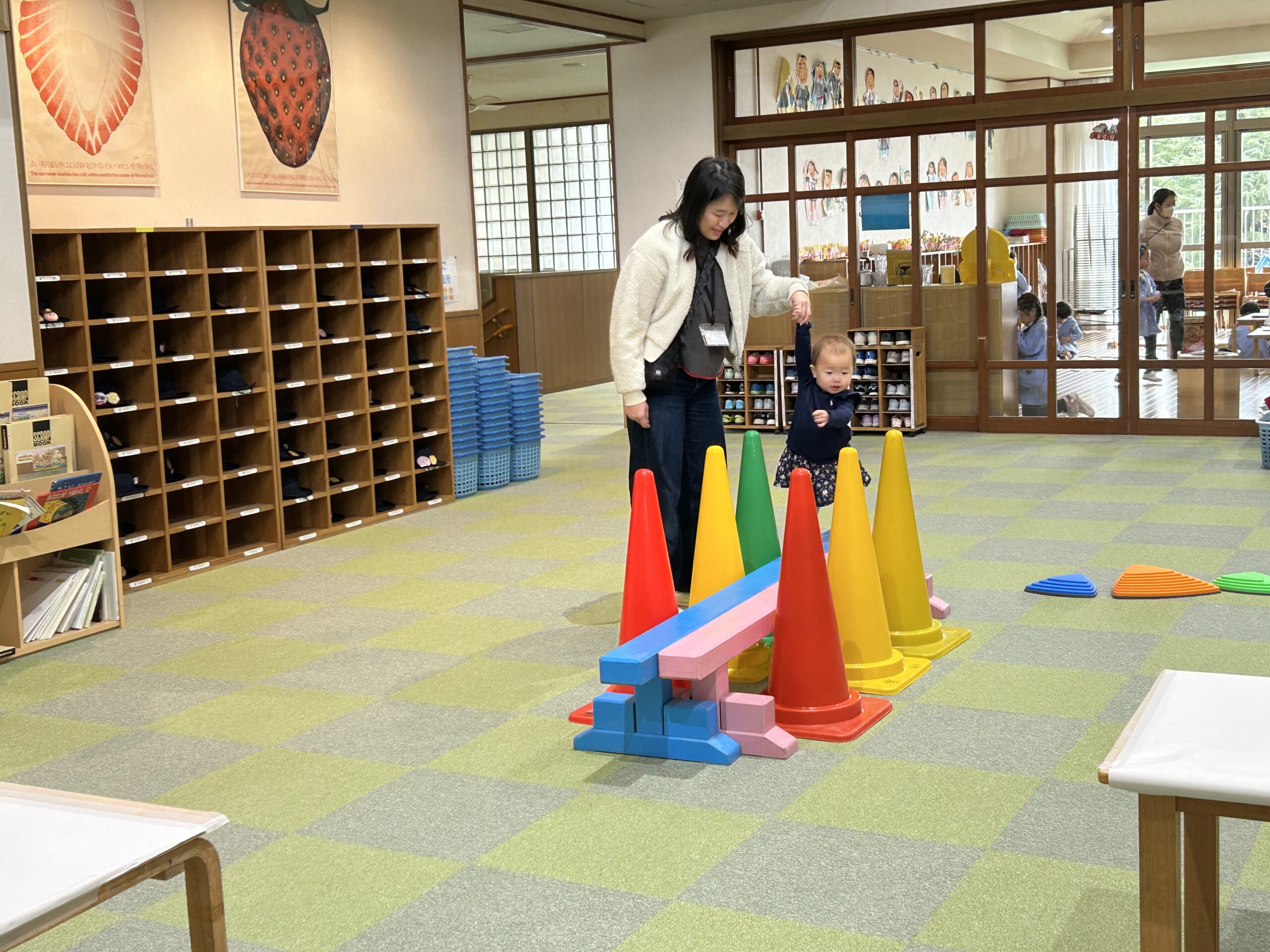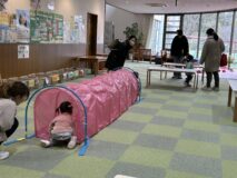 「園庭開放」では、雨天の場合でもエントランスにプレイコーナーを設けていますので遊んでいただけます♪ 園庭とエントランスを行ったり来たり、ご自由に遊んでくださいね☆ ※質問などありましたら、いつでも気軽にお声かけください。 |