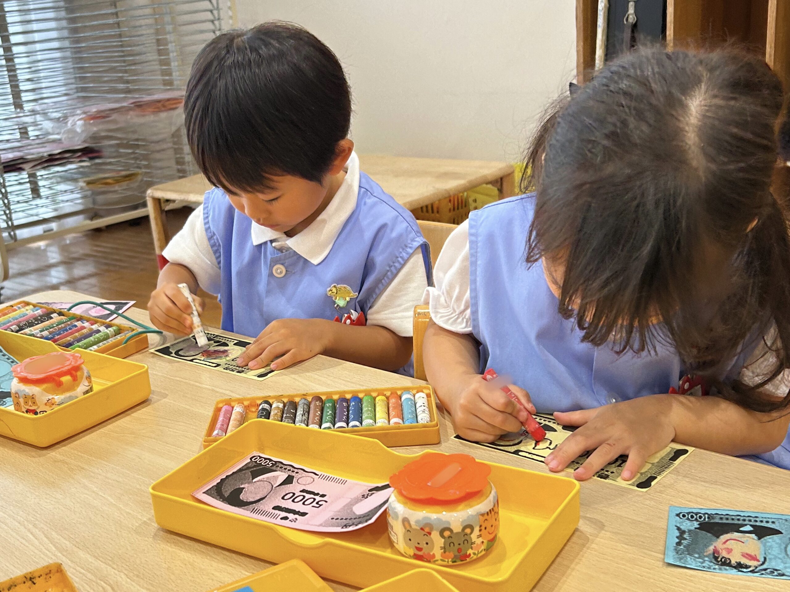 11月にお店屋さんごっこをするんだよ!その時に使う、お財布とお金に絵を描いたんだー♪
