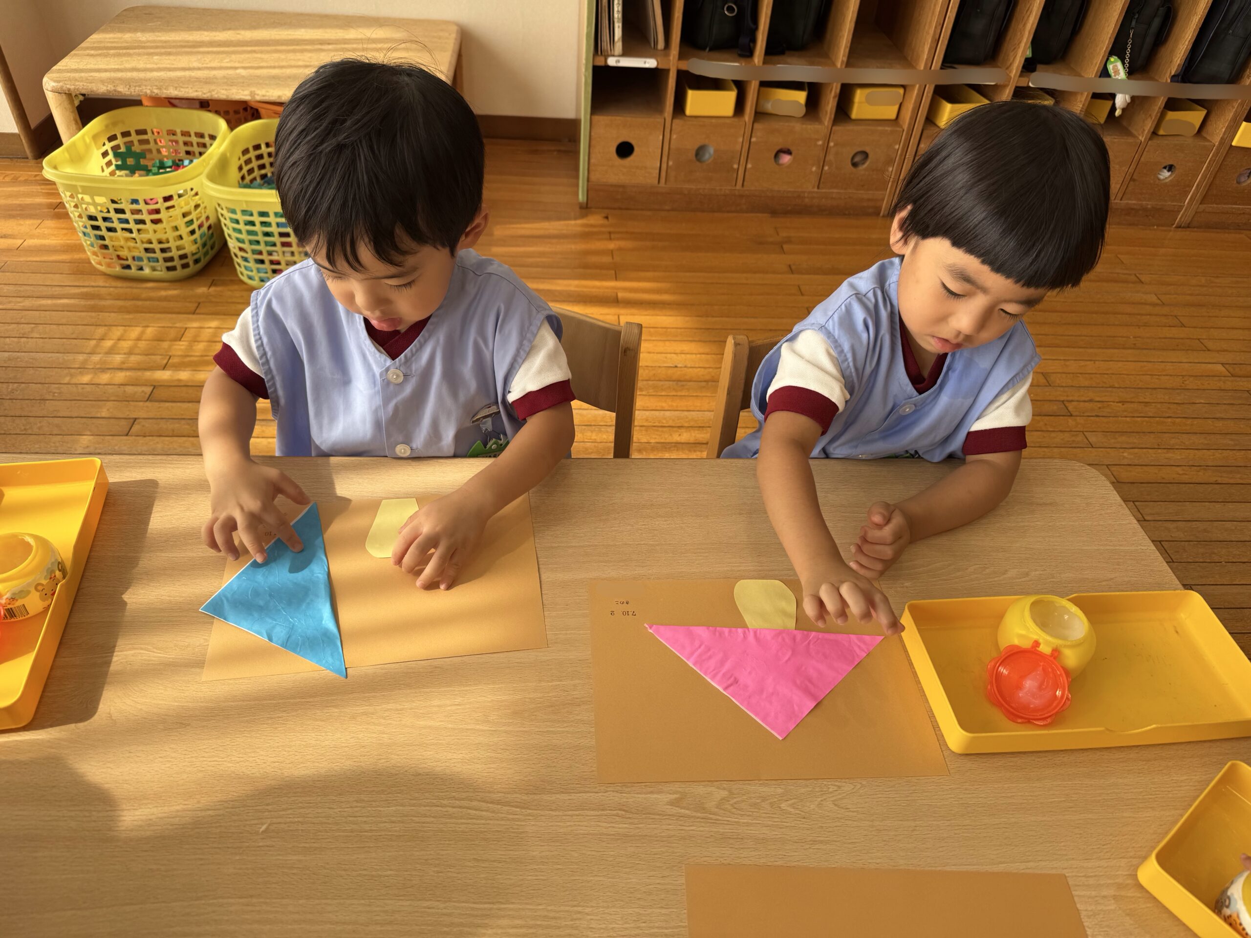 まずは折り紙で、きのこのかさの部分を作るよ~!三角にするんだよ!上手にぴったんこできるかな?(*^_^*)