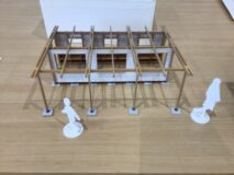 出来た模型を見ながら、出入り口をどうする、屋根の部分は?柱はいるのか?など、