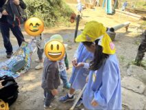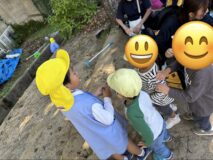 「何組なん?」「どんぐりあげる!ここにいっぱいあるからね」「これは、バッタと赤とんぼ 捕まえたの見せてあげるね」「これは、ヤゴでトンボの赤ちゃんなんだよ。」「これは、川エビでね」「何歳?」などと、年中児・年長児が入れ替わり立ち代わり話に行っていたようで、保育園の先生たちに「みんな、とっても優しくて!!喜んでます。本当にありがとうございます!!」とのこと。