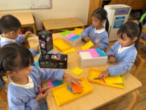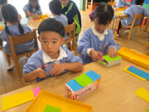 いろいろな箱に折り紙を切って、貼ったんだ^ ^
