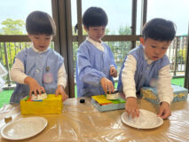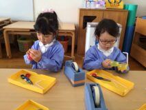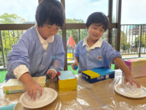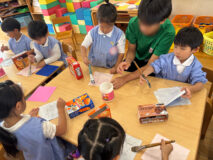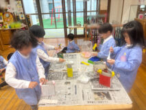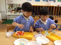 折り紙や包装紙に筆でのりを塗り、箱や牛乳パックに貼ったんだ^ ^