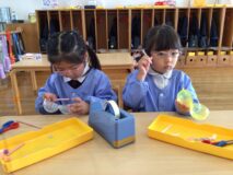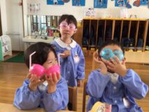 ガチャガチャボールをメガネにしよう!まずは、見える透明ガチャガチャの仕分けから。折れ曲がるストローの耳かけを左右合わせるのは、何度もチェック!