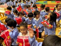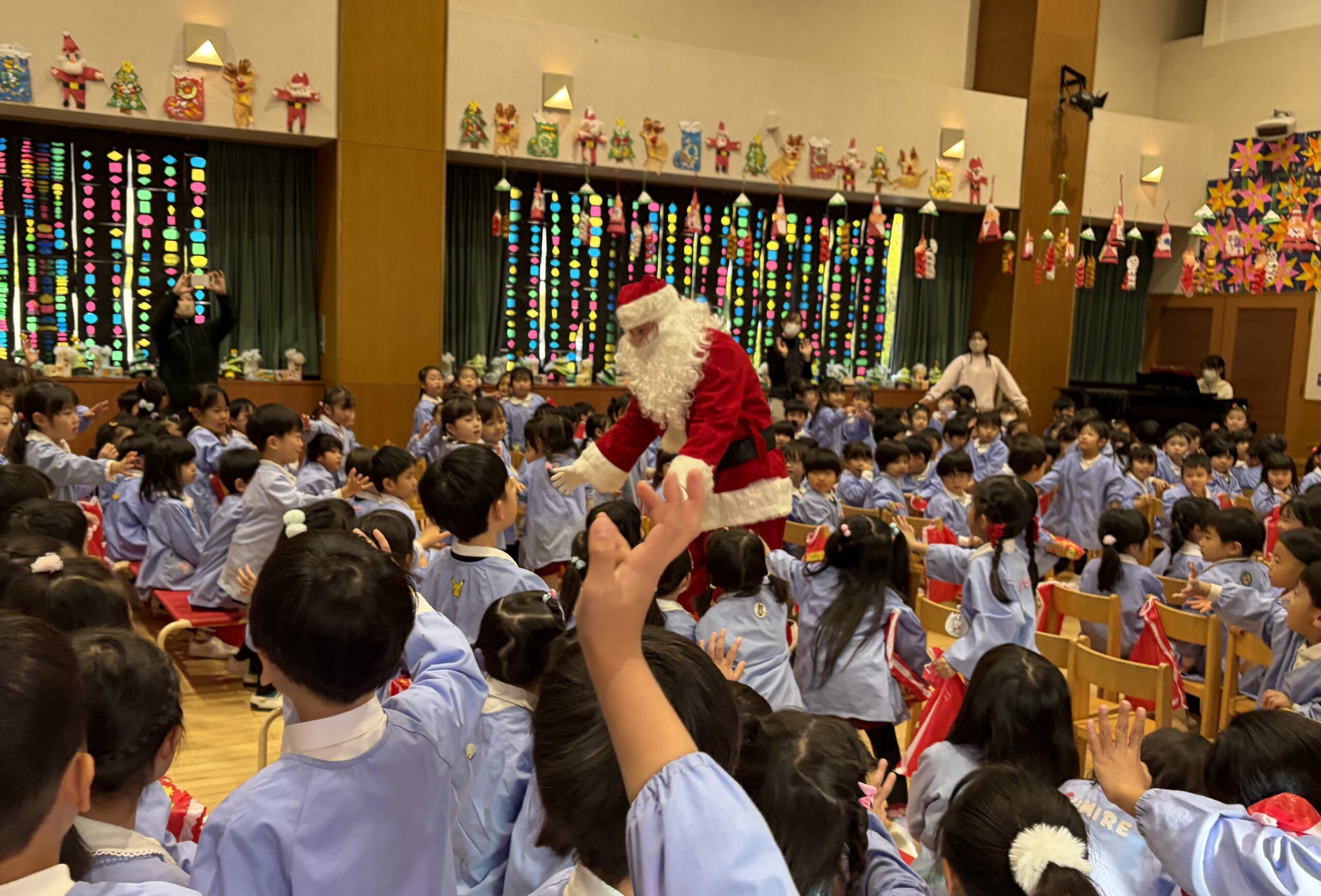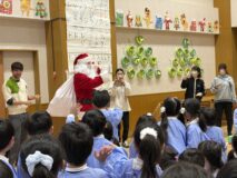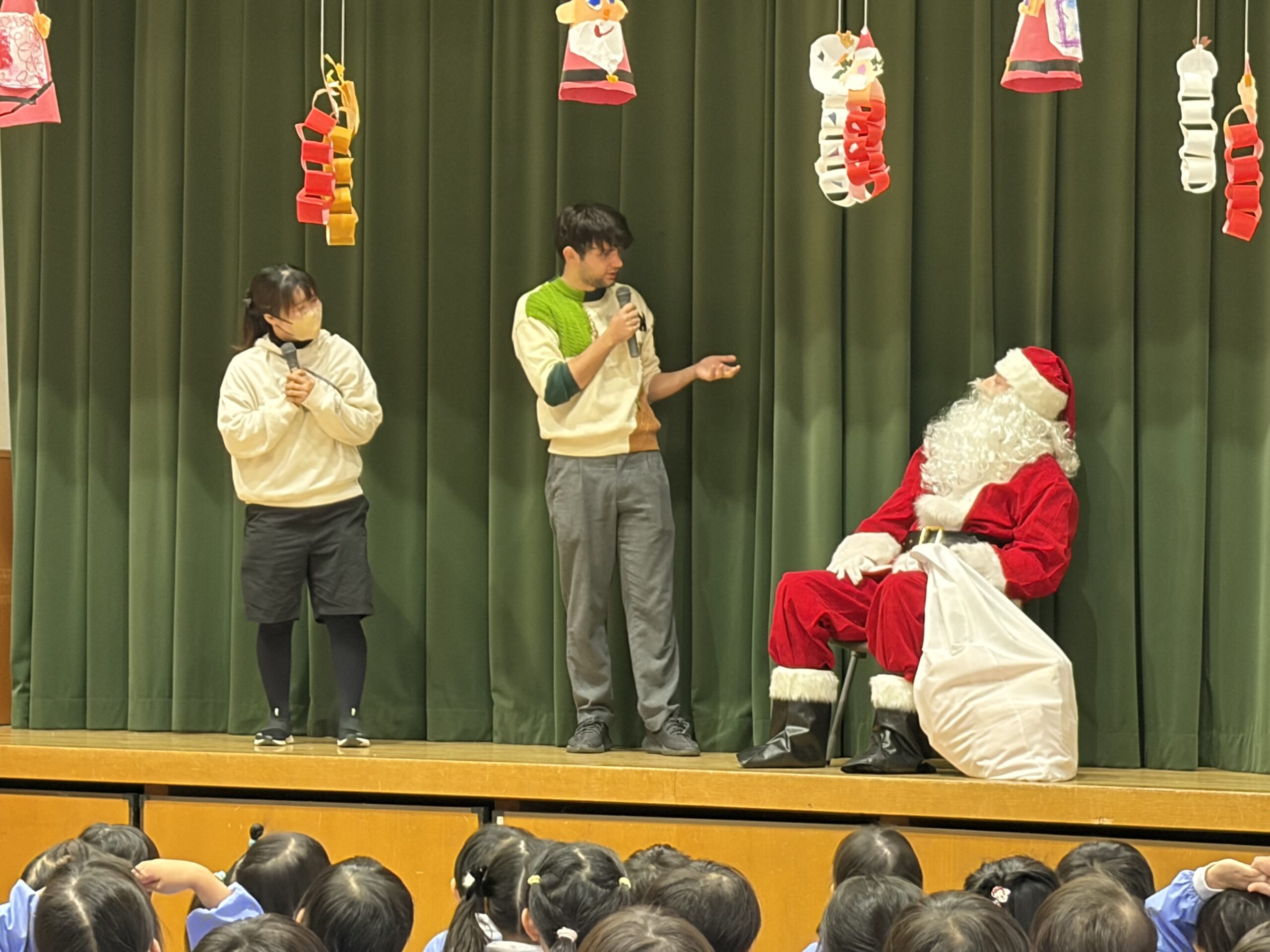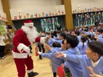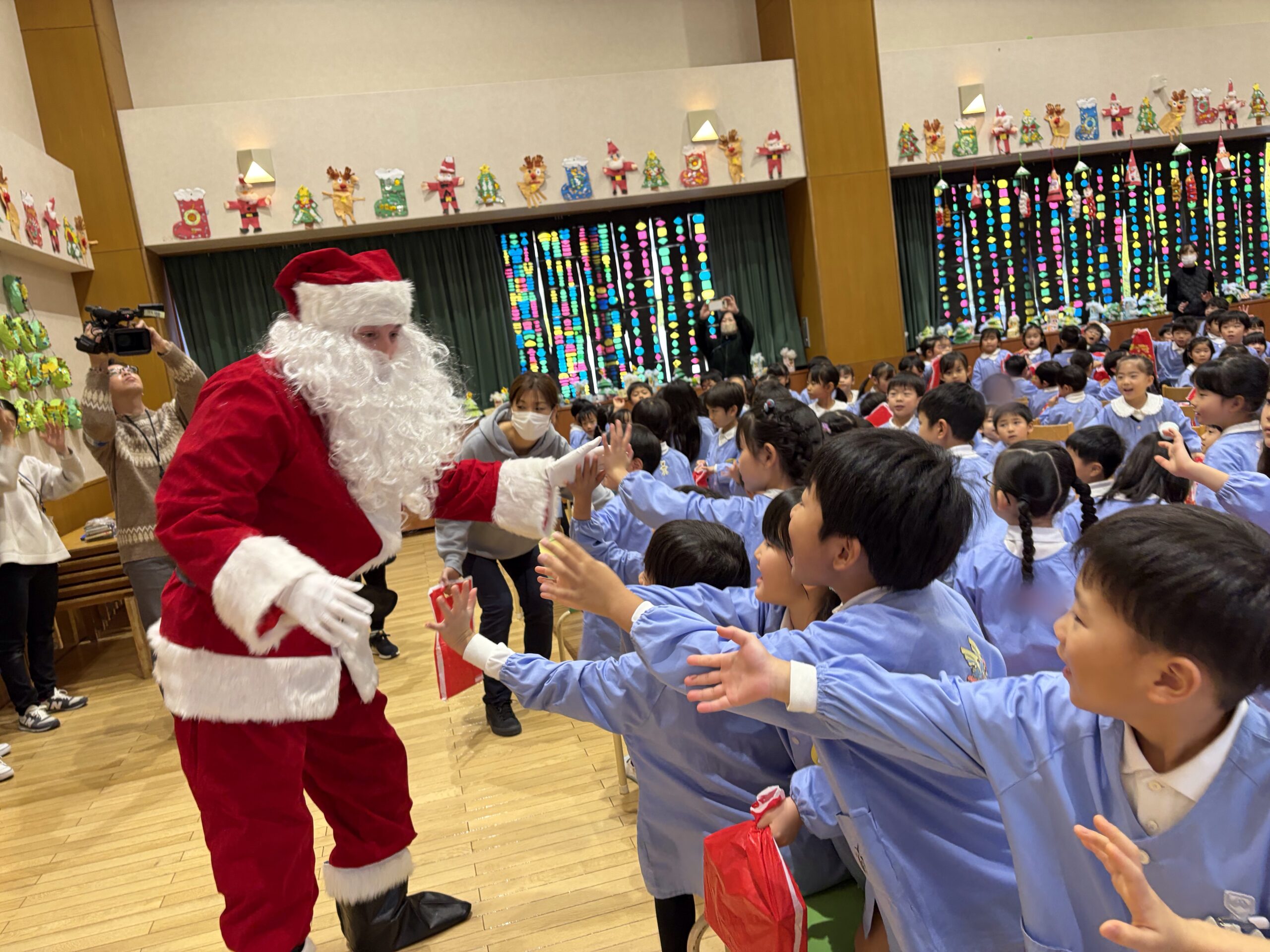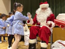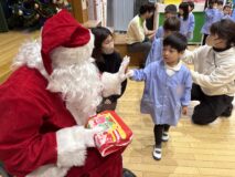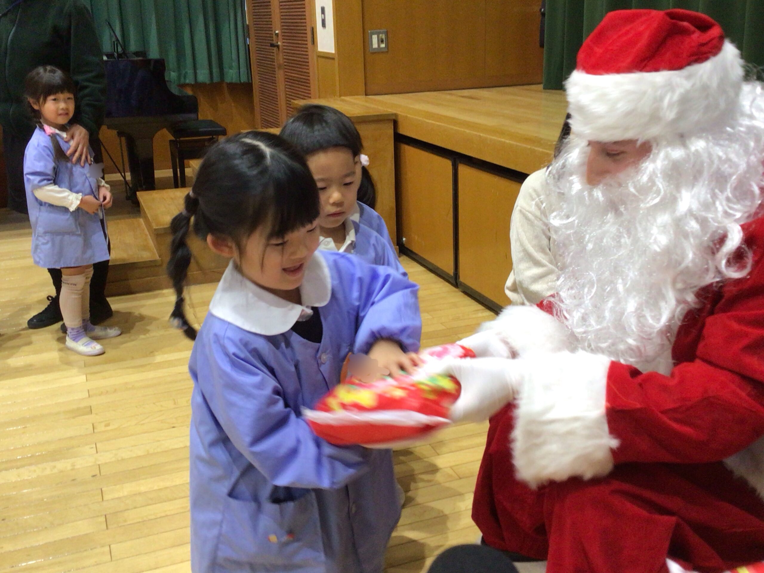 その後、順番に一人ずつサンタさんからプレゼントをもらったよ。手をタッチ!英語で挨拶もしたんだ♪