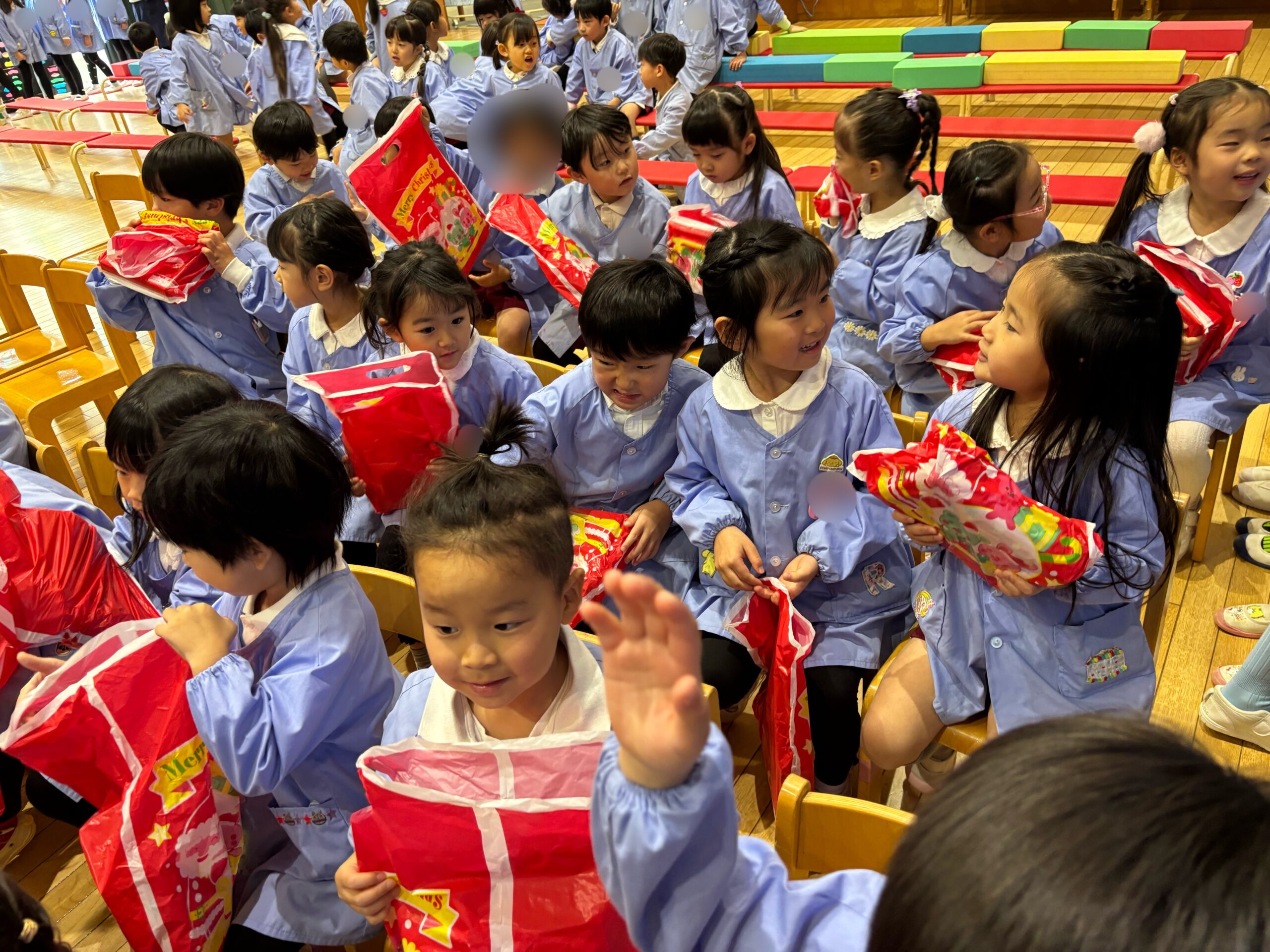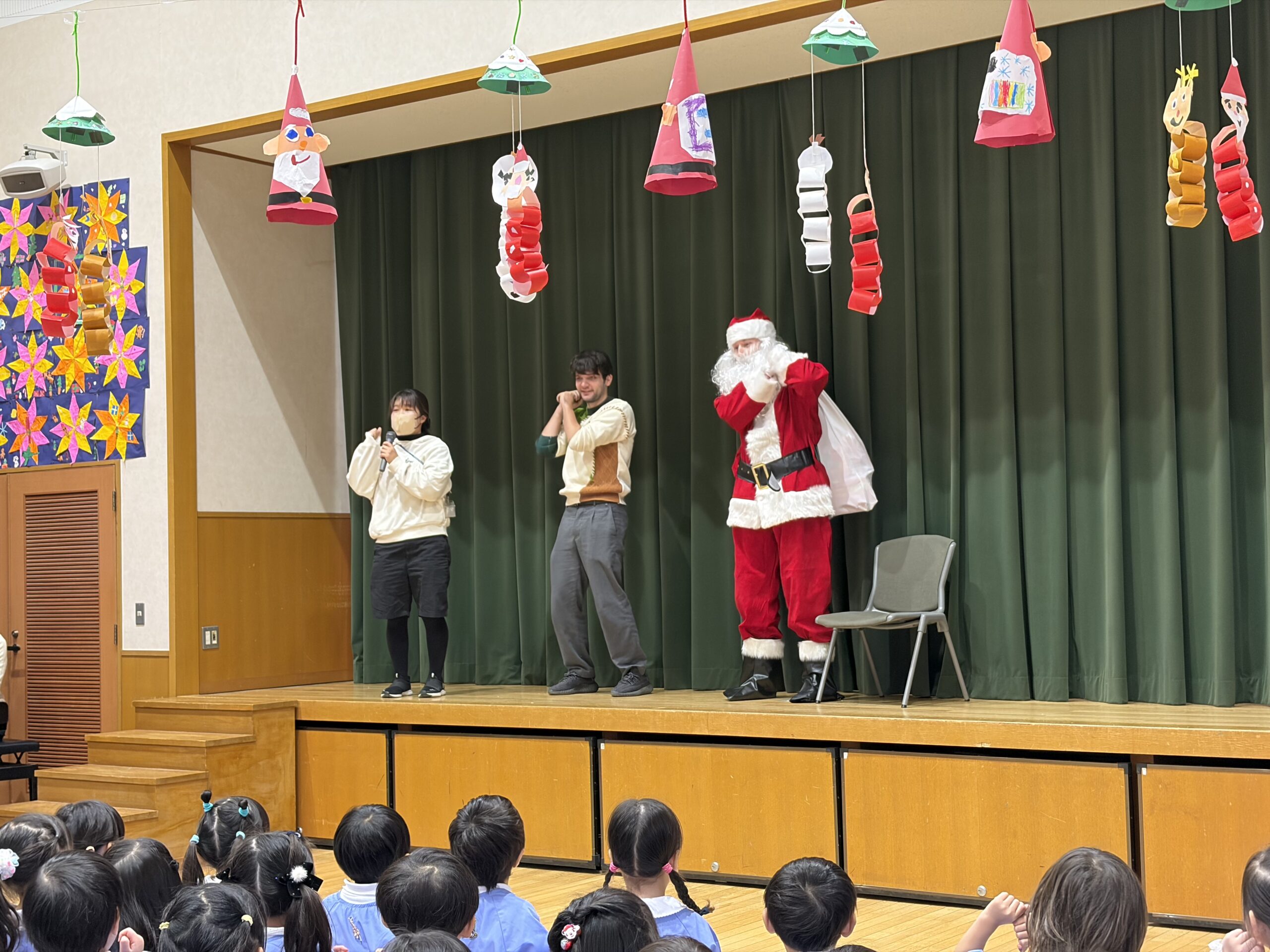 「サンタさん、まだ来ないね〜。幼稚園はここだよ!とわかるように、ジングルベルの歌を届けよう!」ジングルベルを歌っているとシャンシャン…と鈴の音が聞こえて来て「Merry Christmas!」サンタさんが登場!