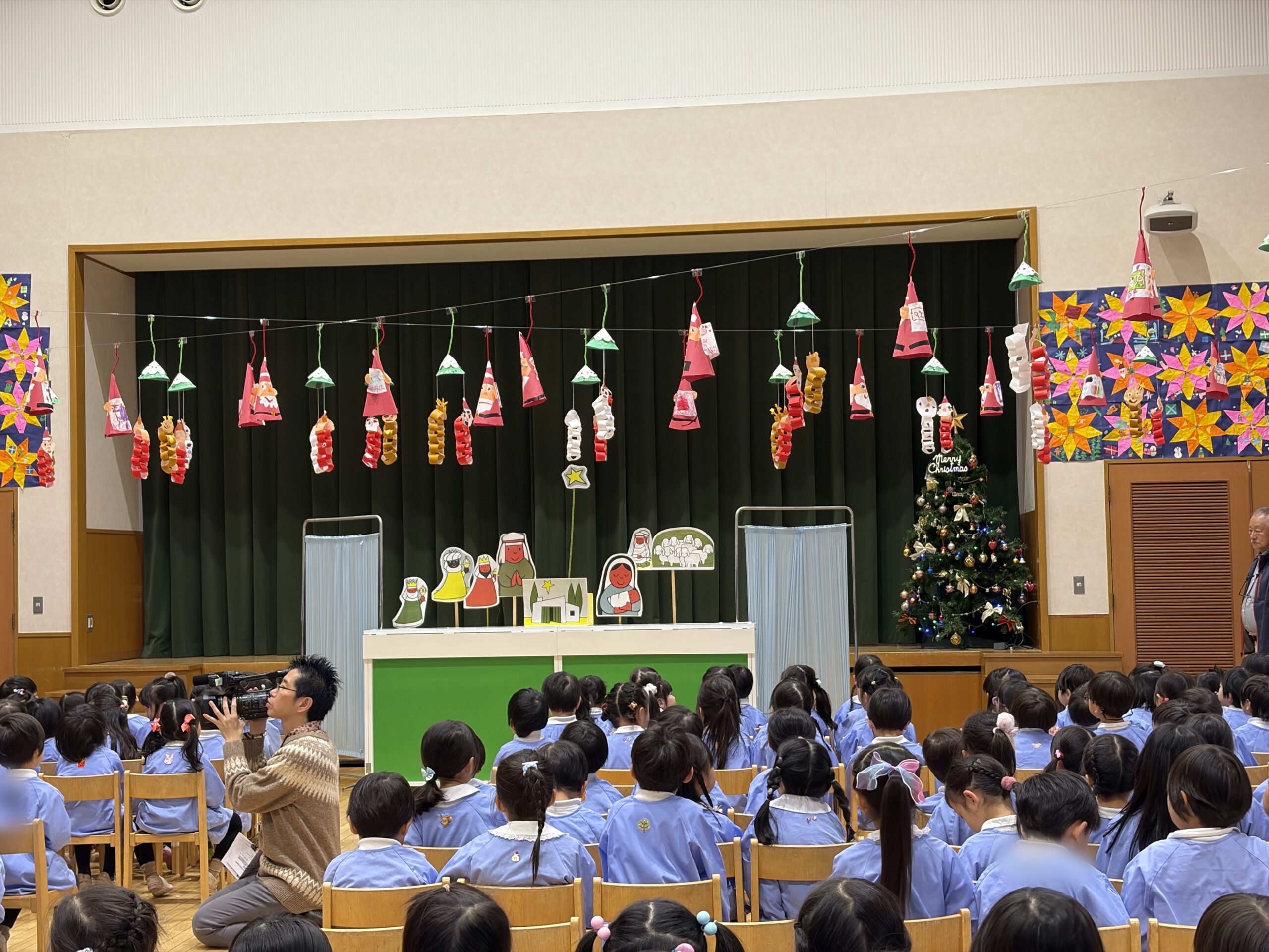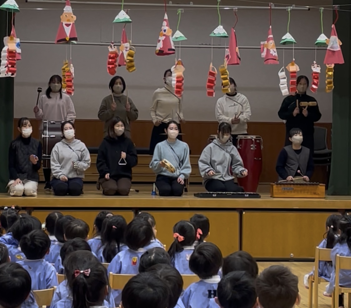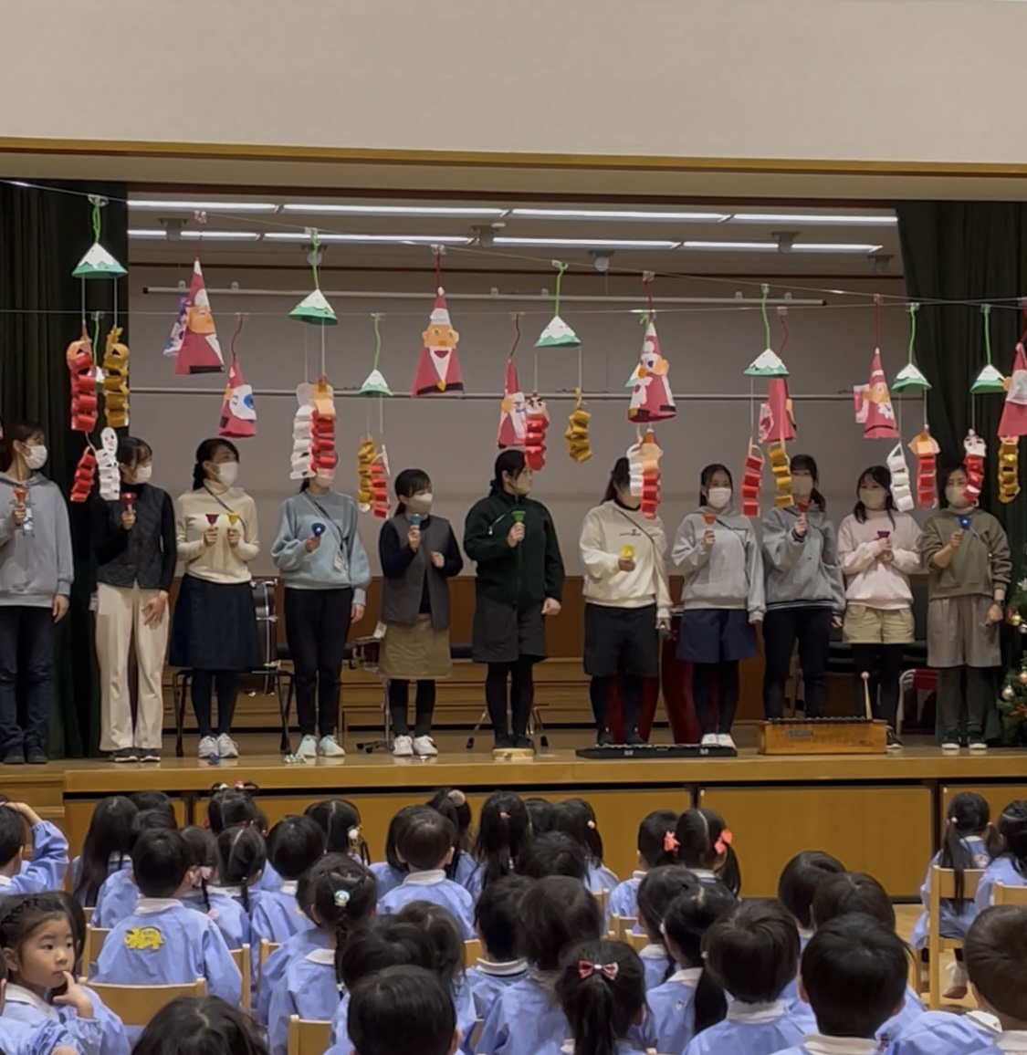 その後は、先生達が大集合!ハンドベルで「We wish you a merry Christmas」、園のたくさんの楽器での「赤鼻のトナカイ」の合奏を聞いたよ。上手だったな〜。(^O^)