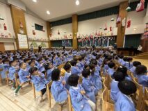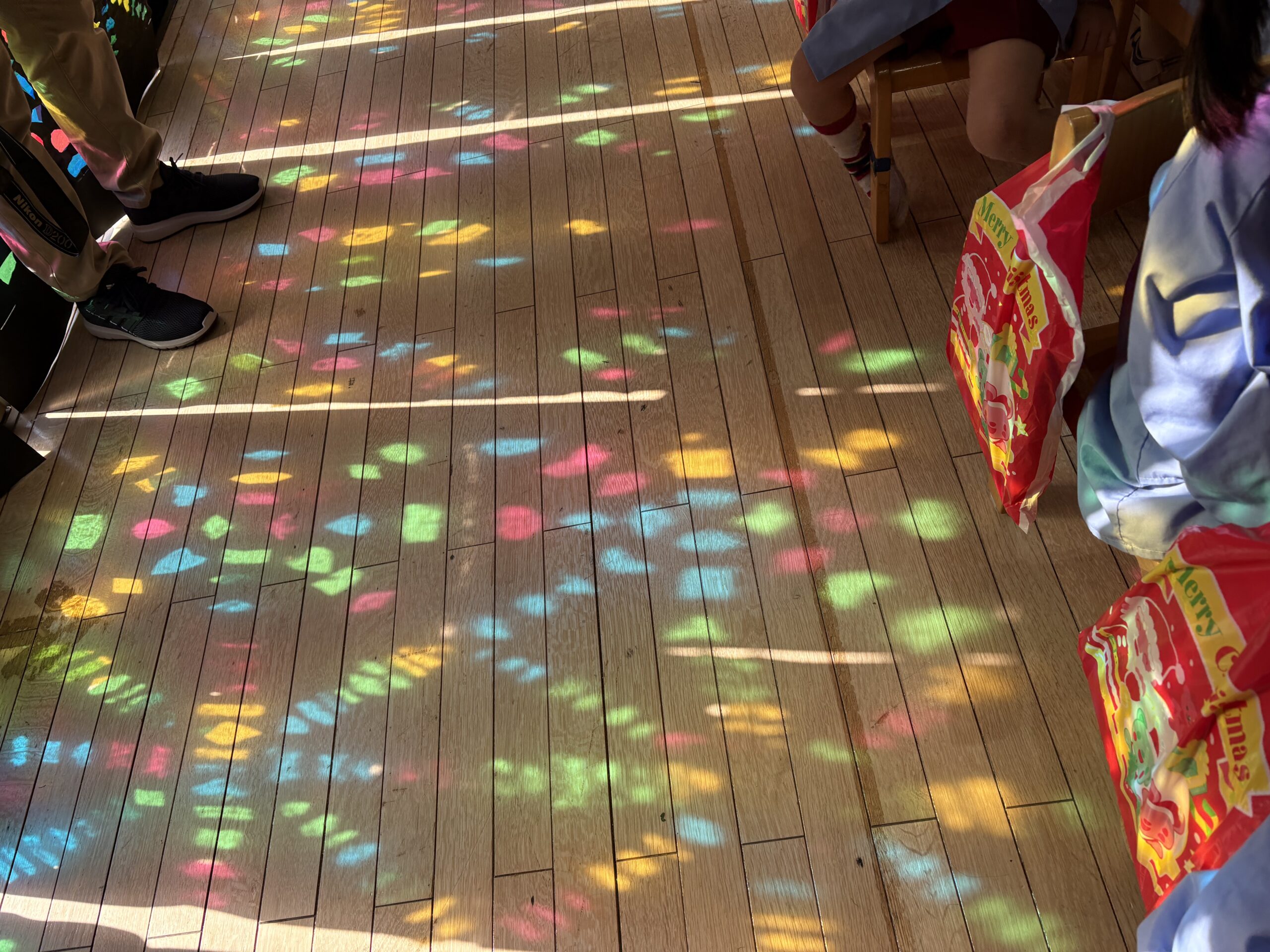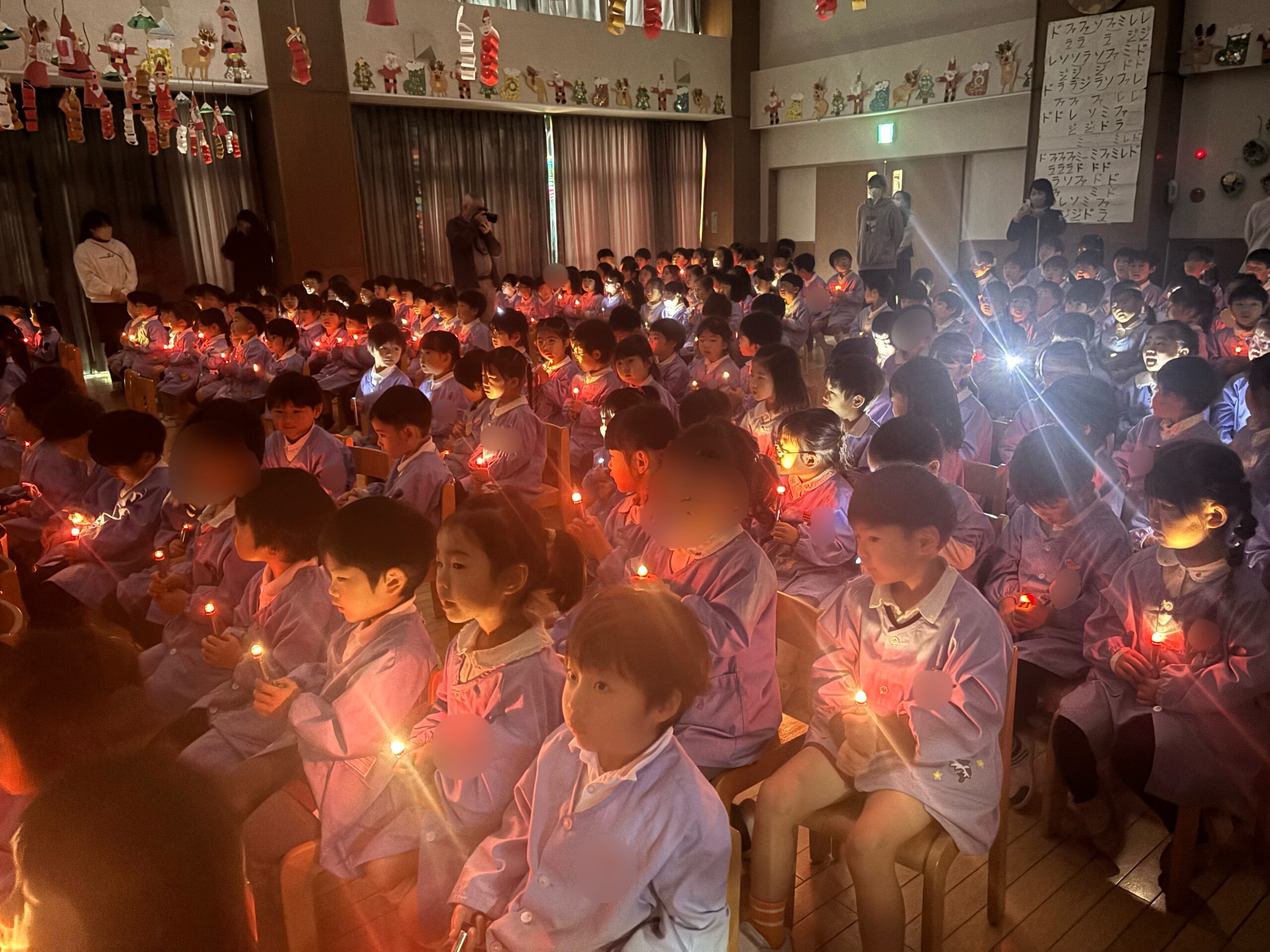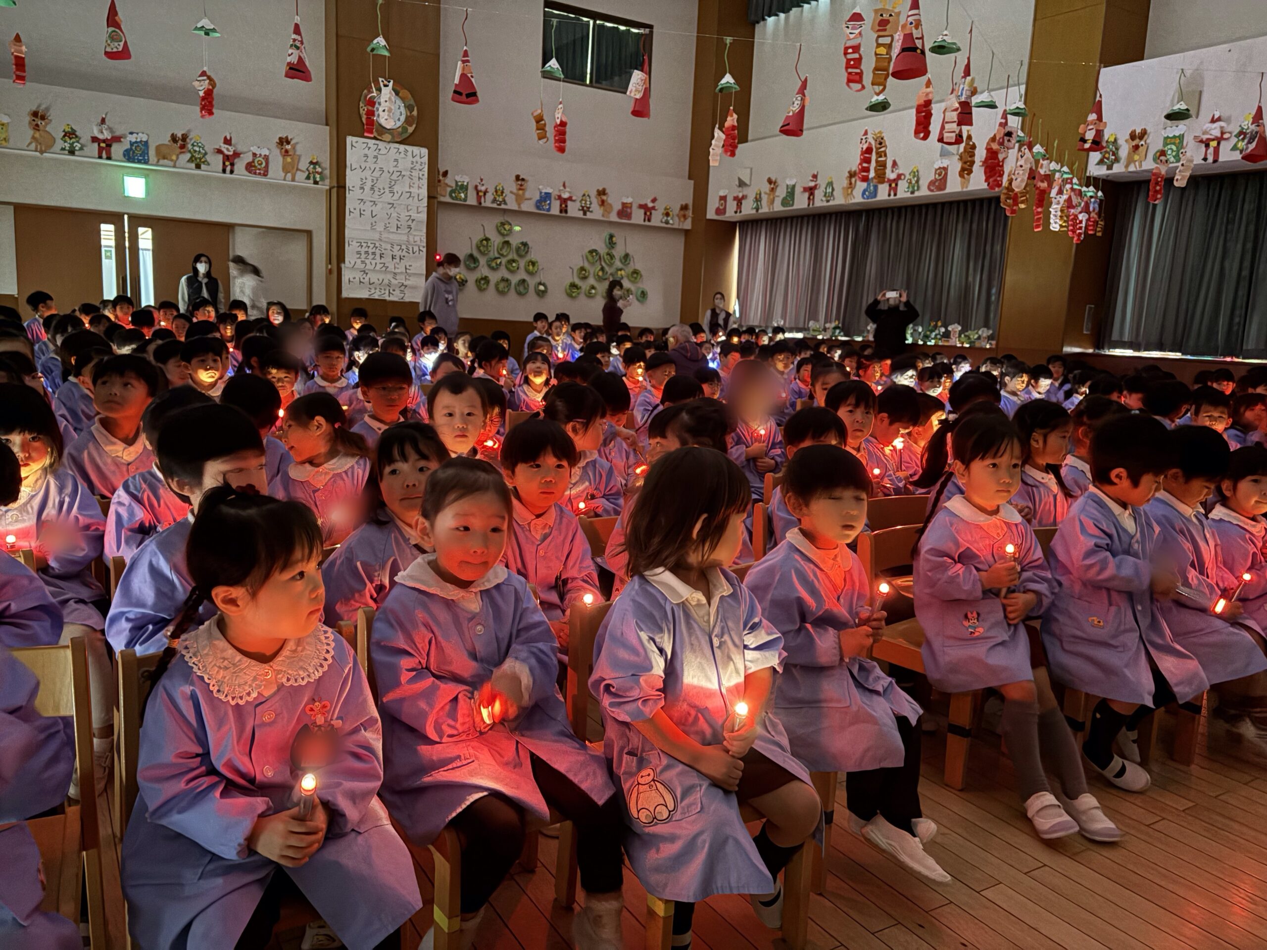 ペンライトで「キャンドルサービス」もしたよ。これはみんなの心のあかりなんだって。灯して電気を消すと、本当にきれいなあかりに包まれたんだ。「きよしこの夜」を歌ってお祈りしたよ。「優しく、明るく、たくましいこどもになれますように。」「私達が持っているあかりを、困っている人や悲しんでいる人に分けられますように。」