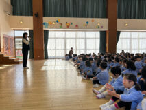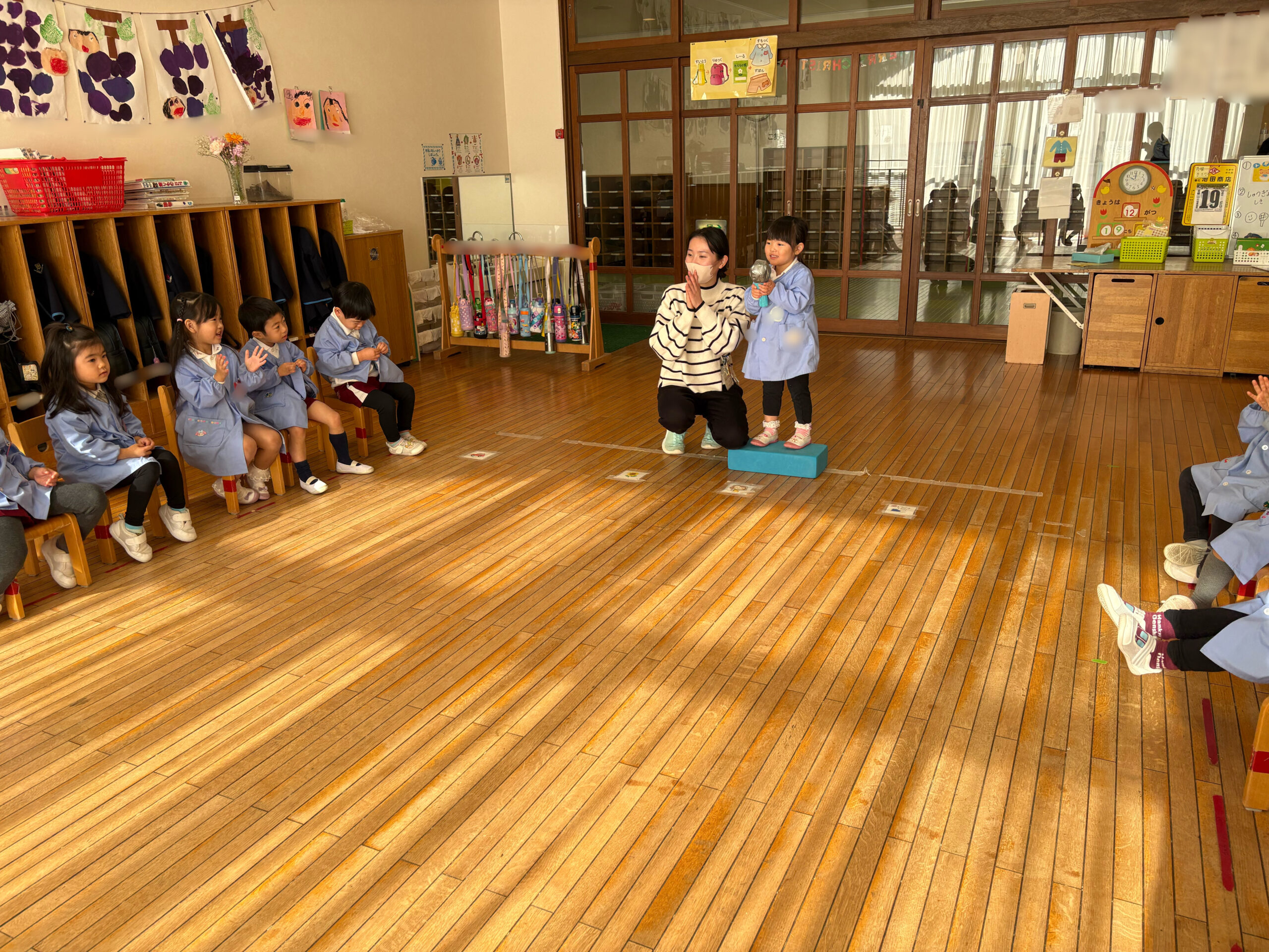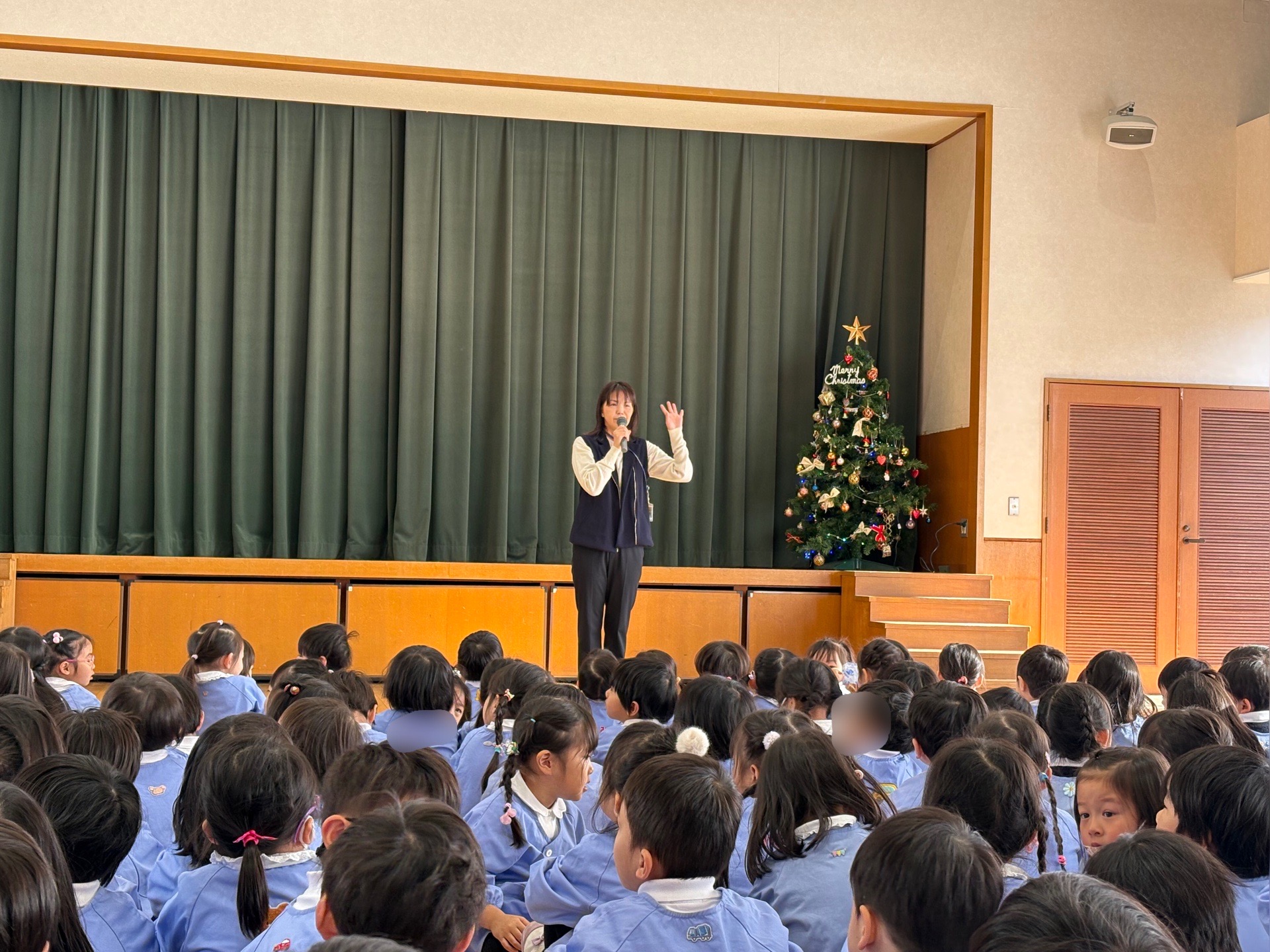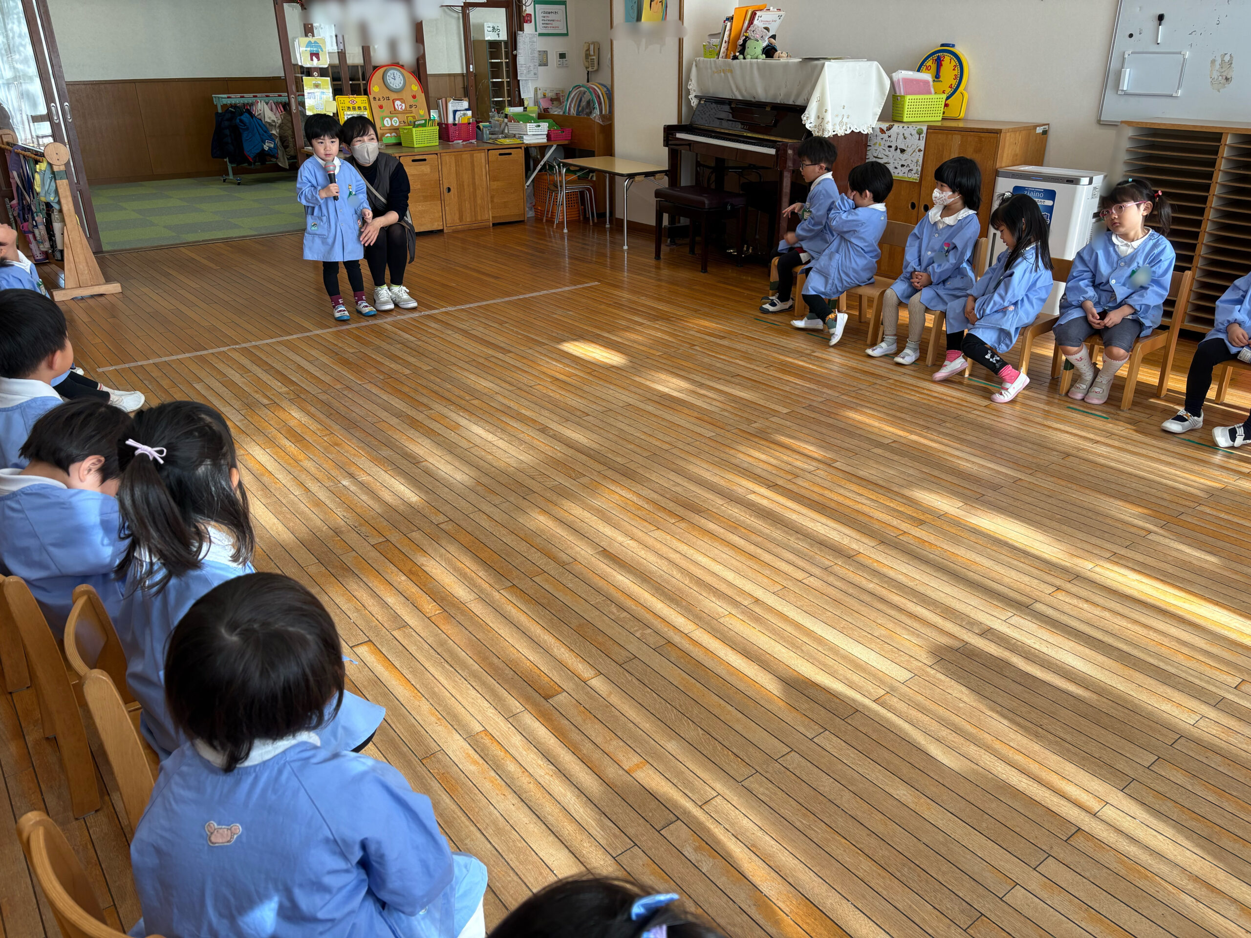 今日は2学期最後の日。みんなでホールに集まって終業式をしたよ(^_^)/園長先生が、2学期に頑張ったことや冬休みの約束をお話してくれたよ。