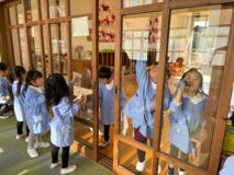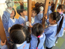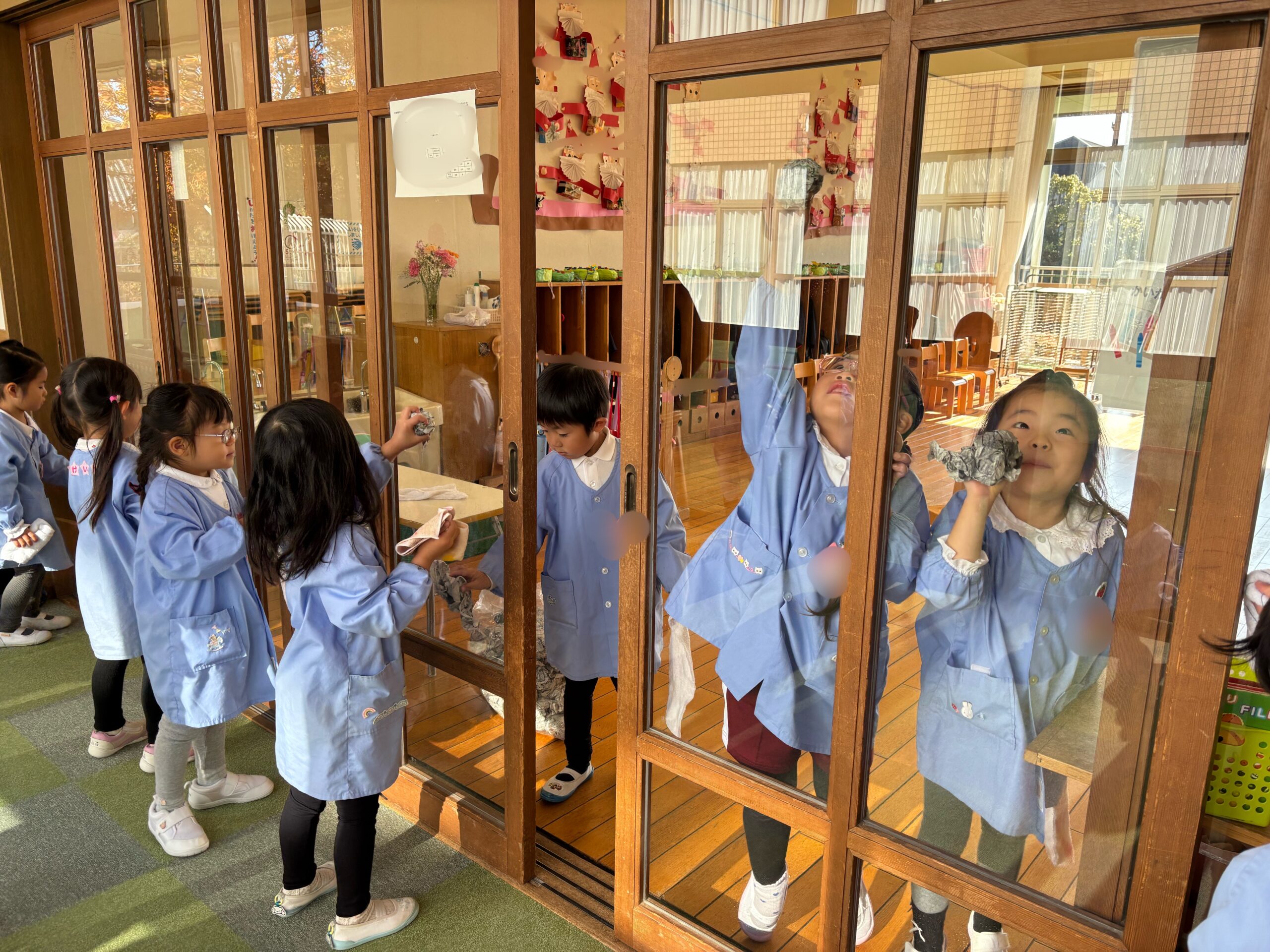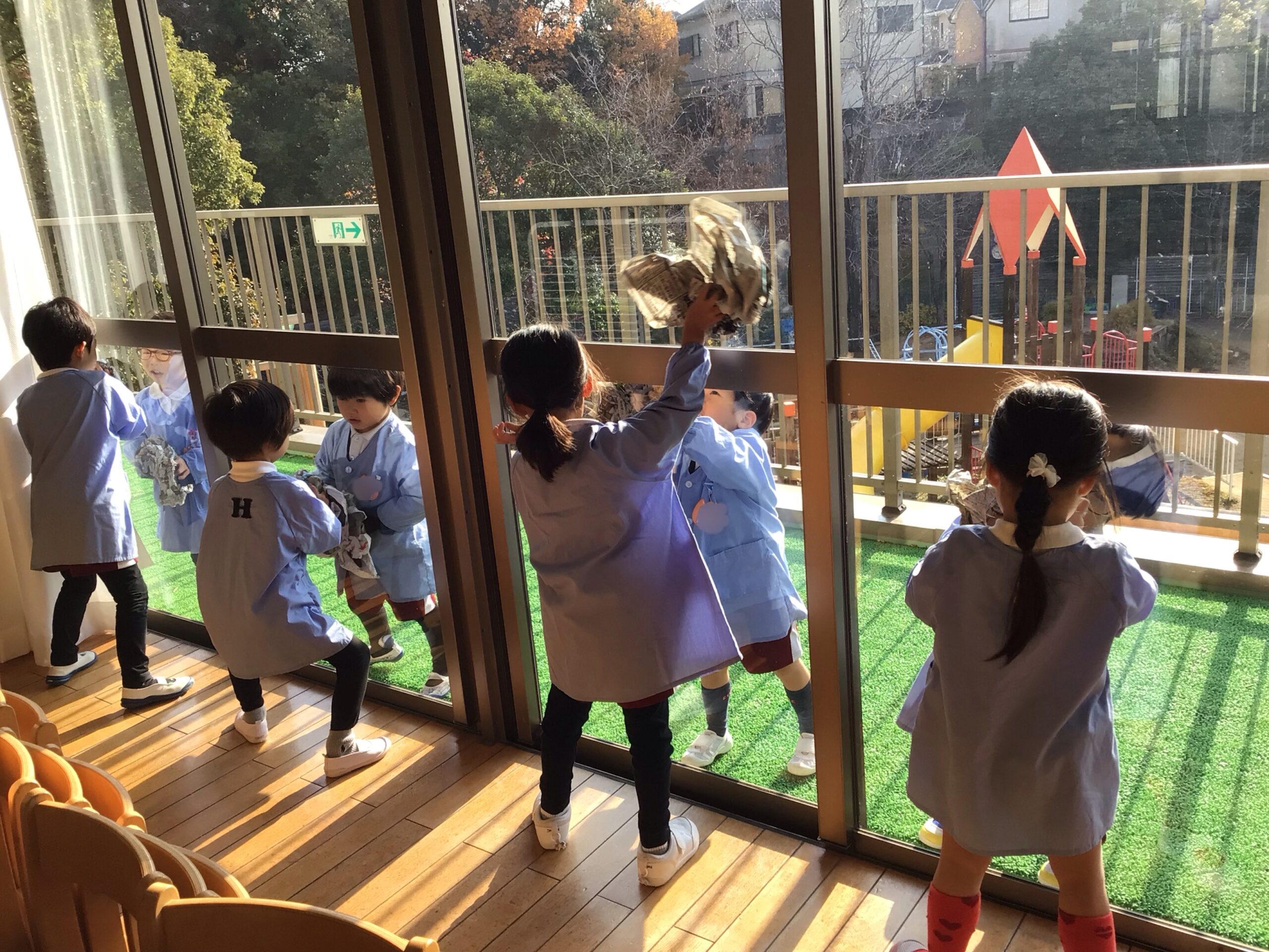 窓は、先生が水拭きした後を、新聞紙で磨いたよ。ほら、とっても綺麗になったでしょ♪