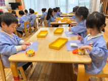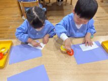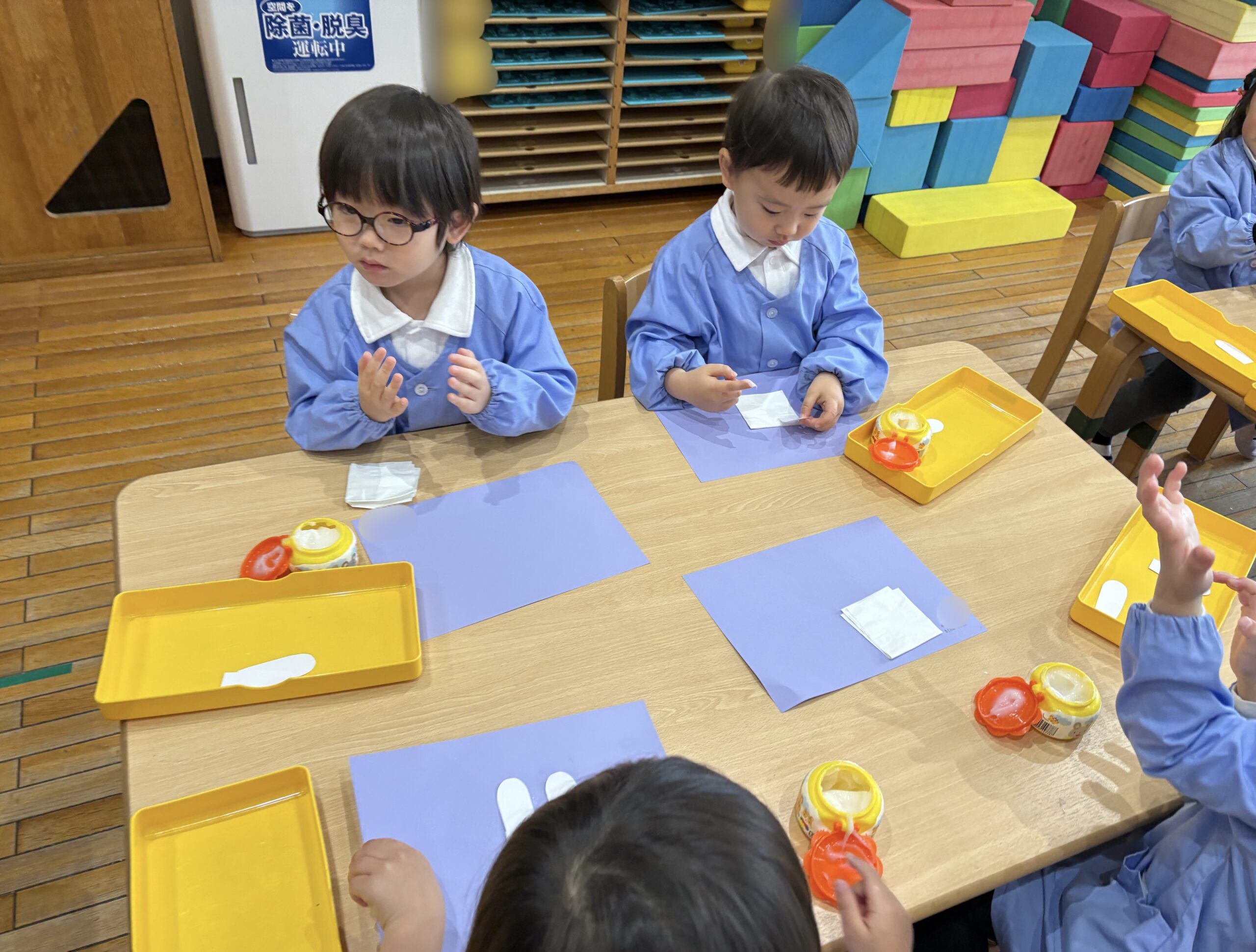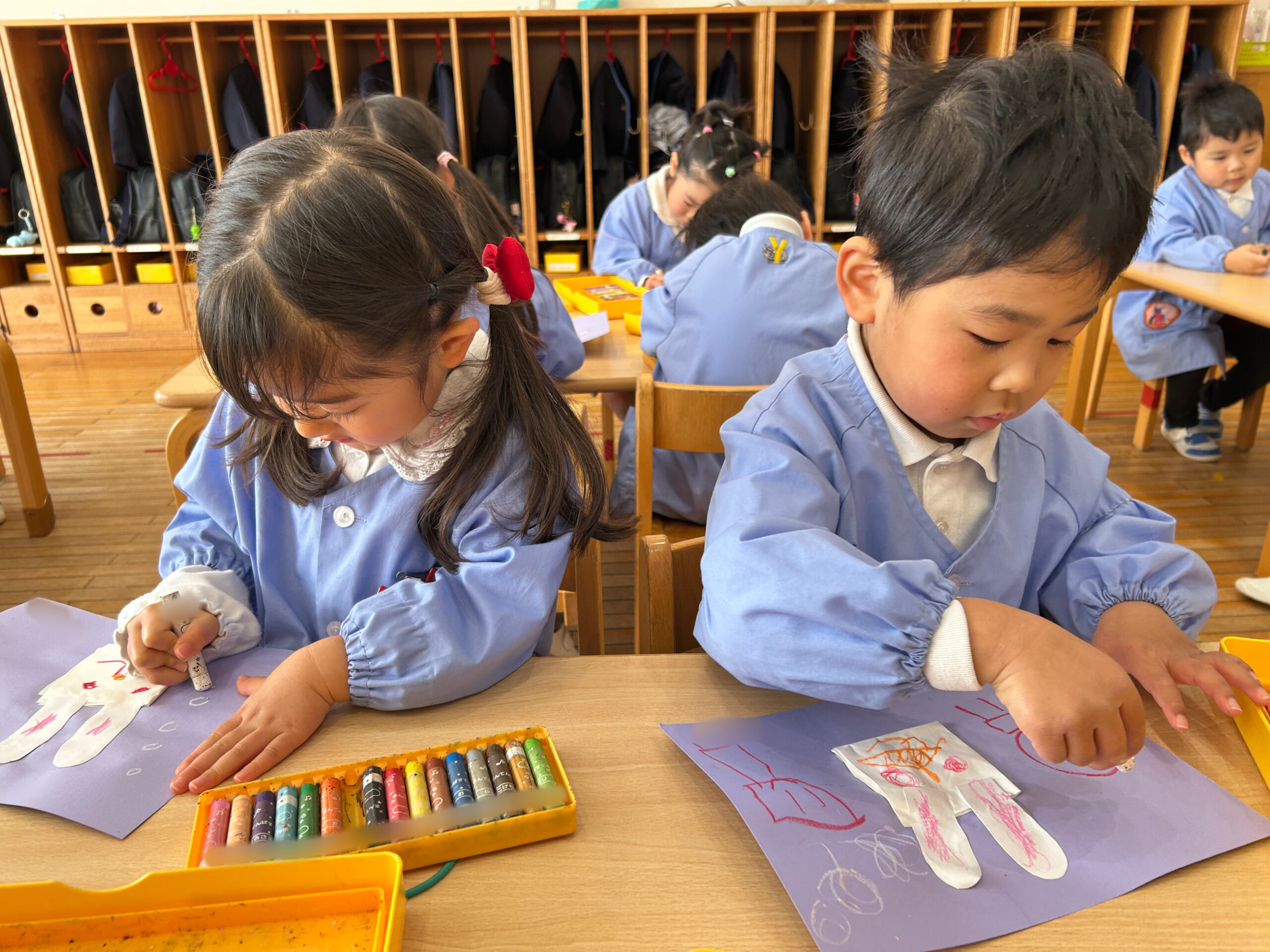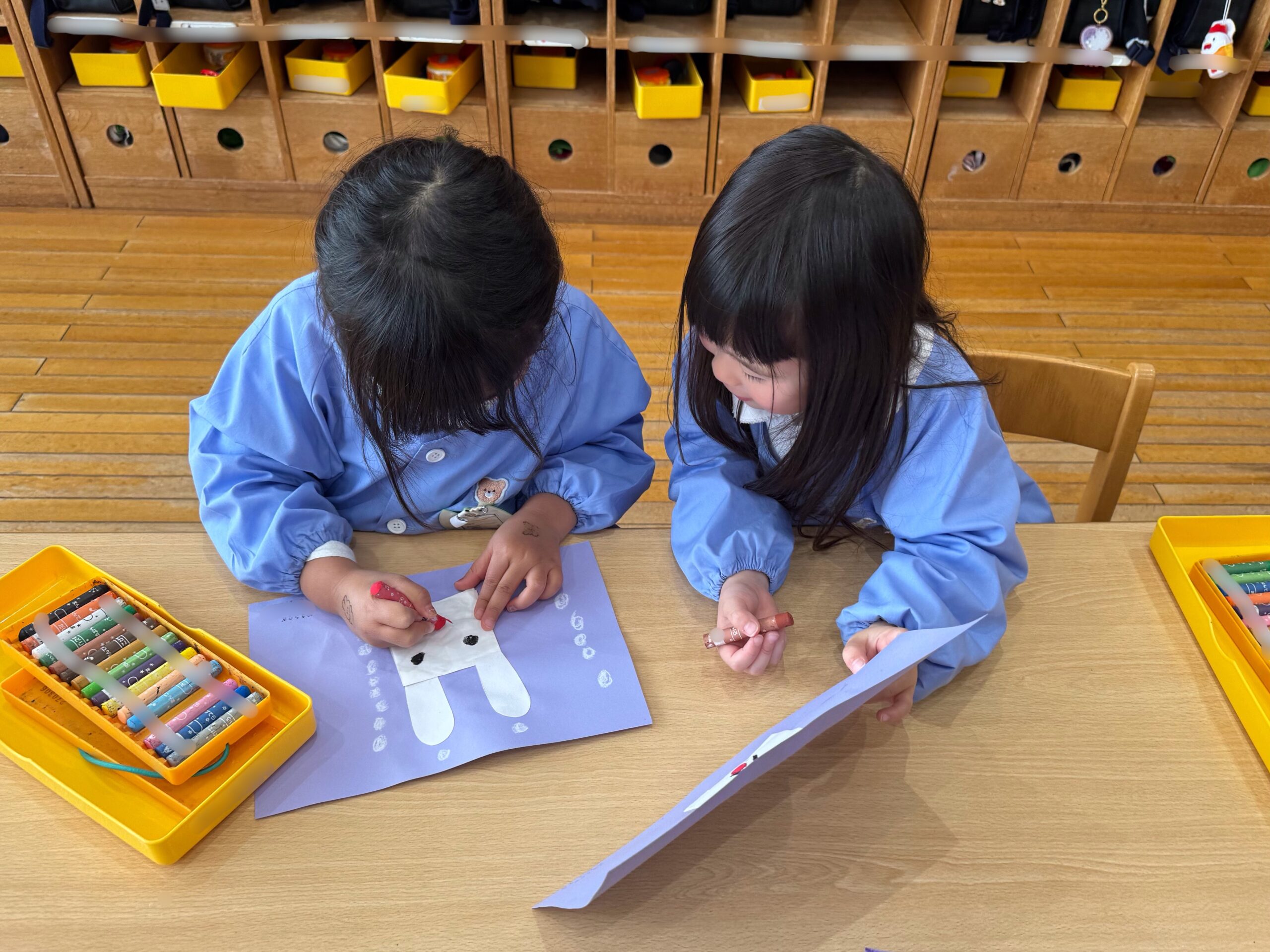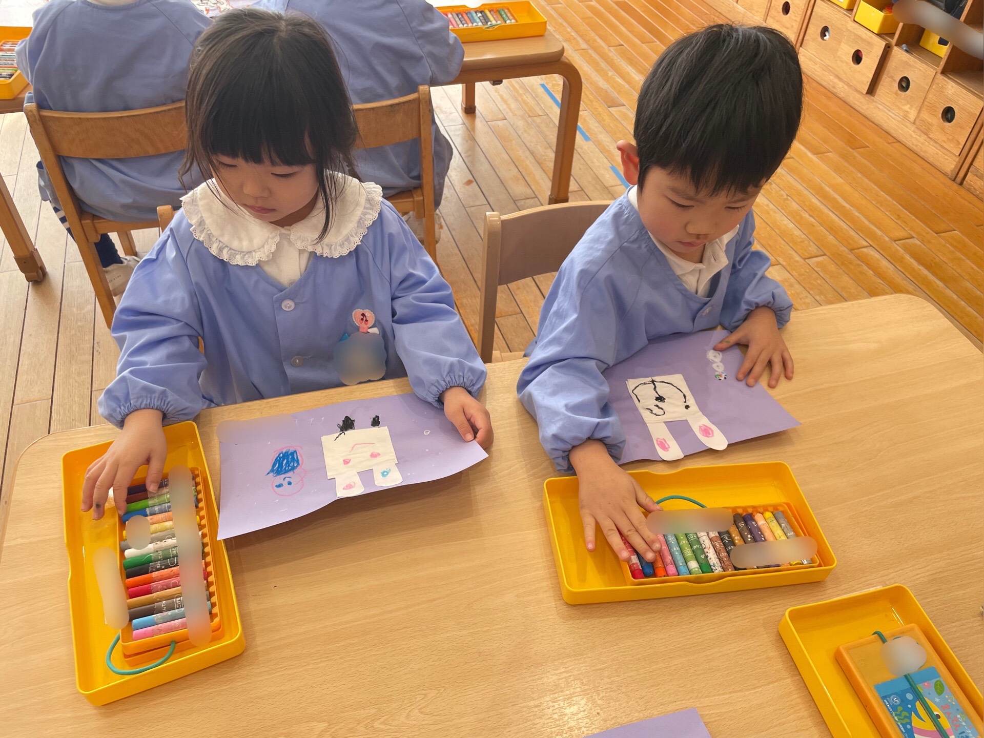 クレパスでお顔を描いて、周りには雪や好きなものを描いたよ〜!!