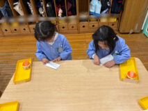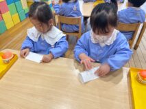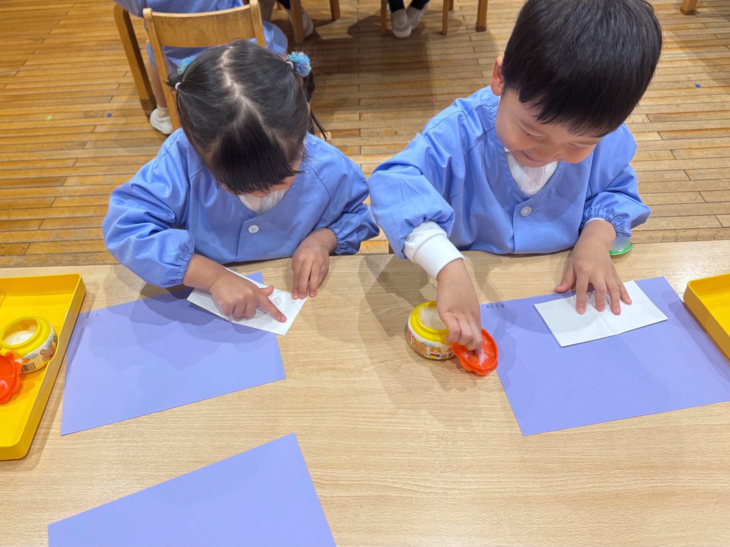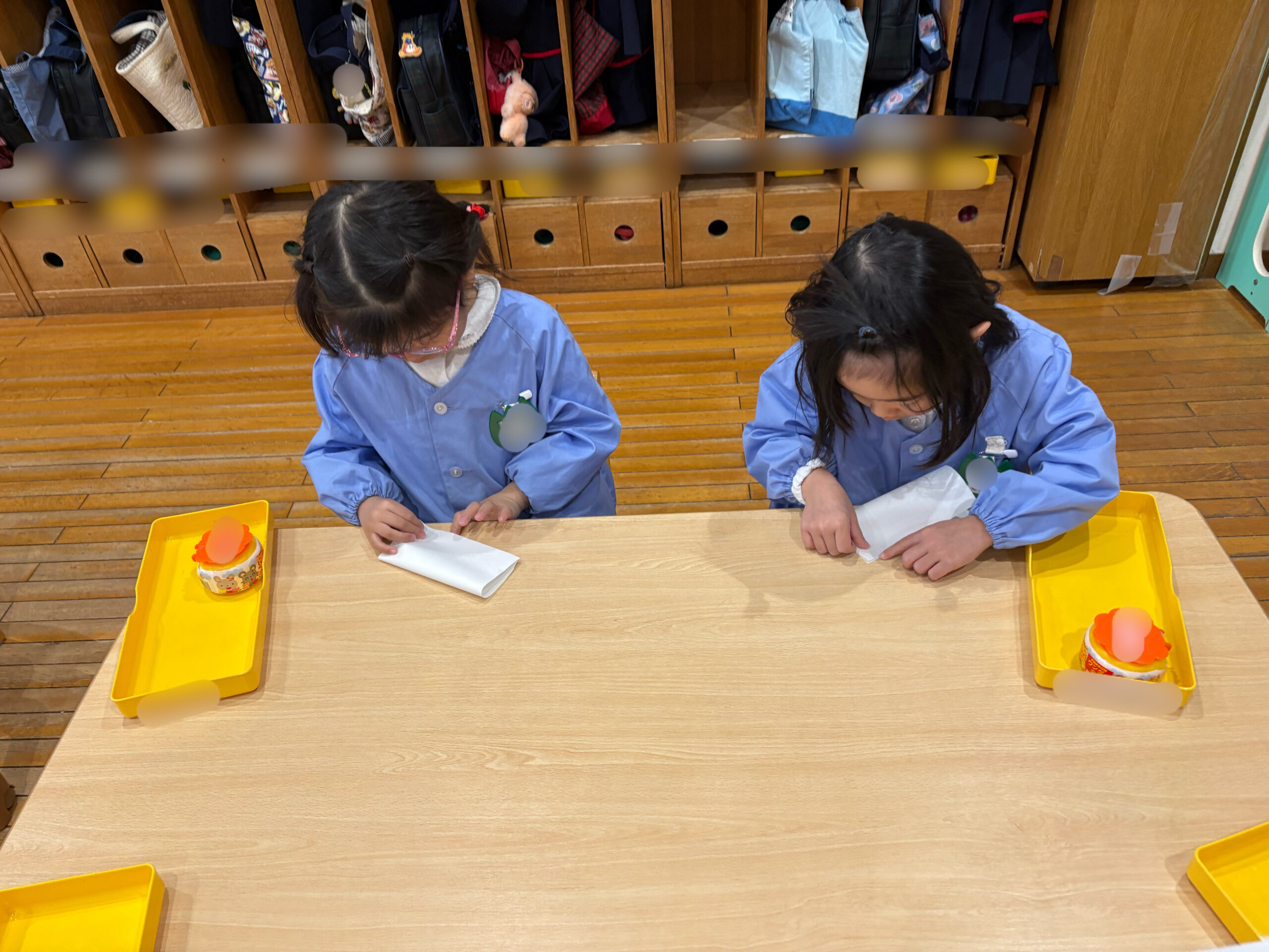 白い折り紙で雪うさぎを折ったよ!!四角を2回折って小さい四角にしたよ〜!角を合わせるぞー⭐︎