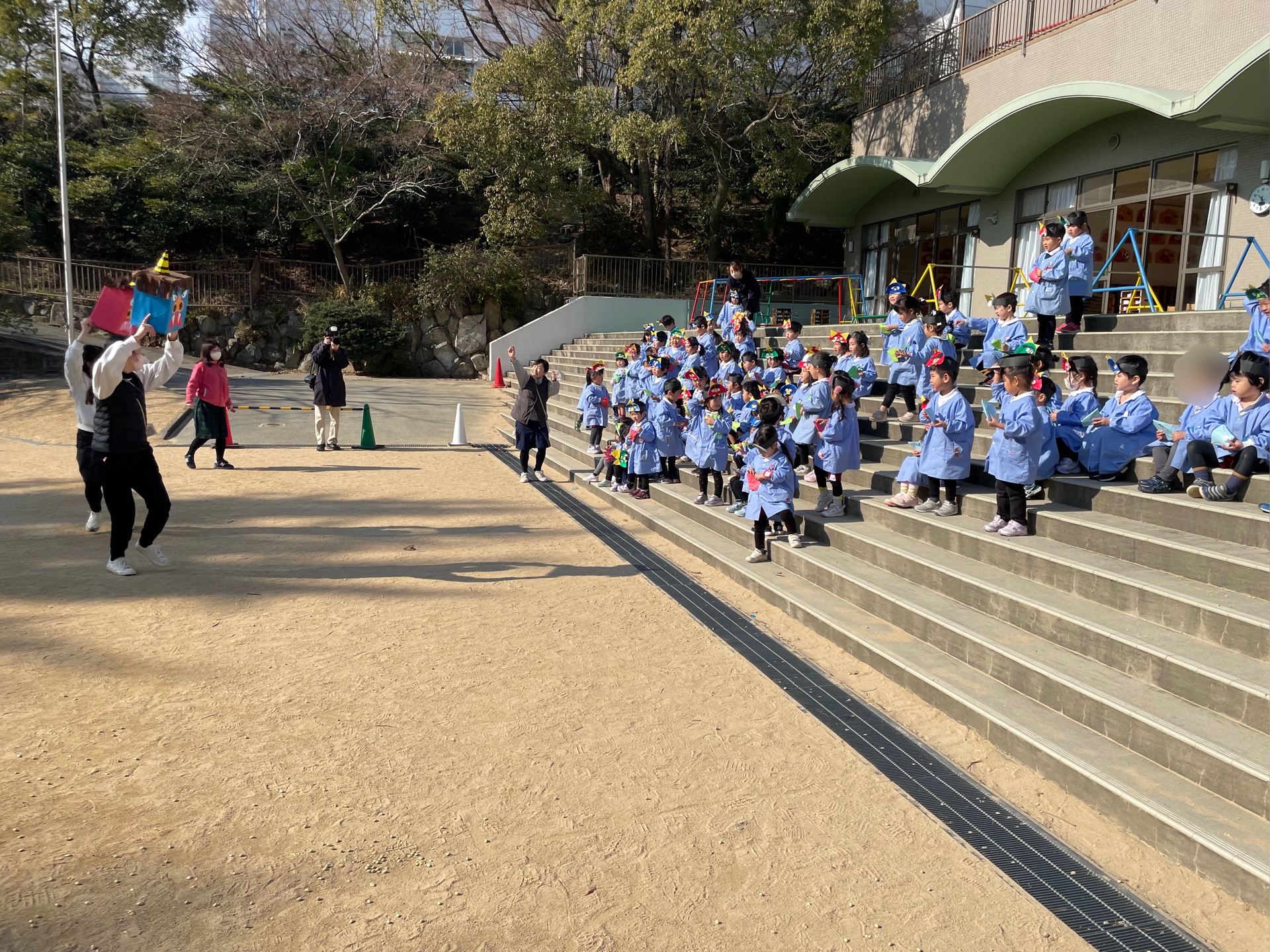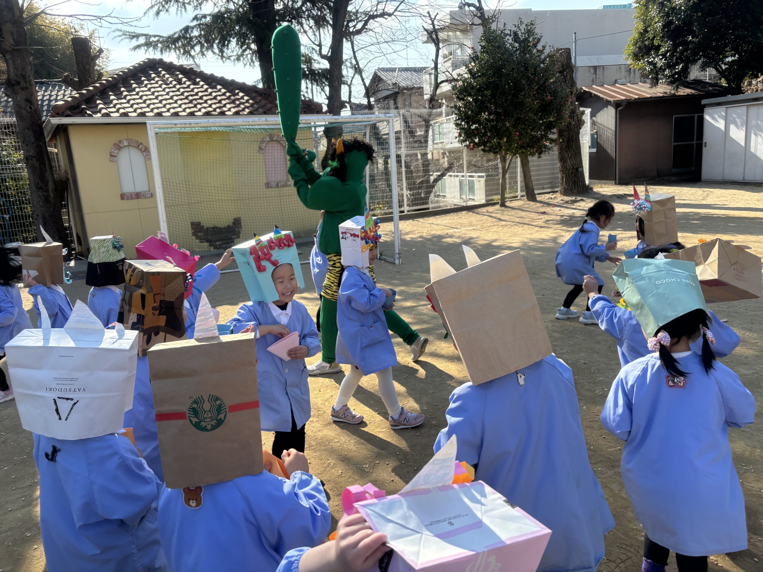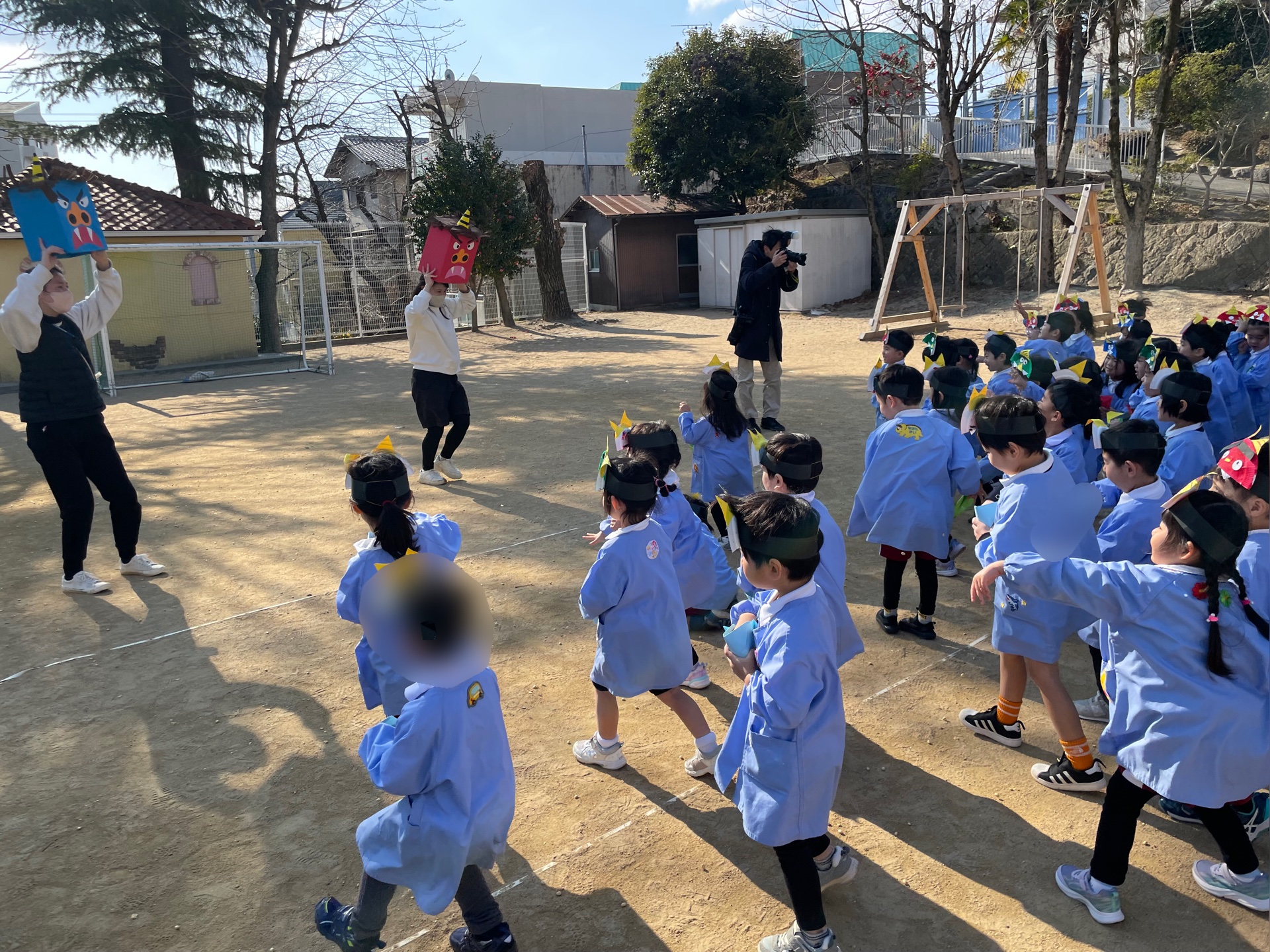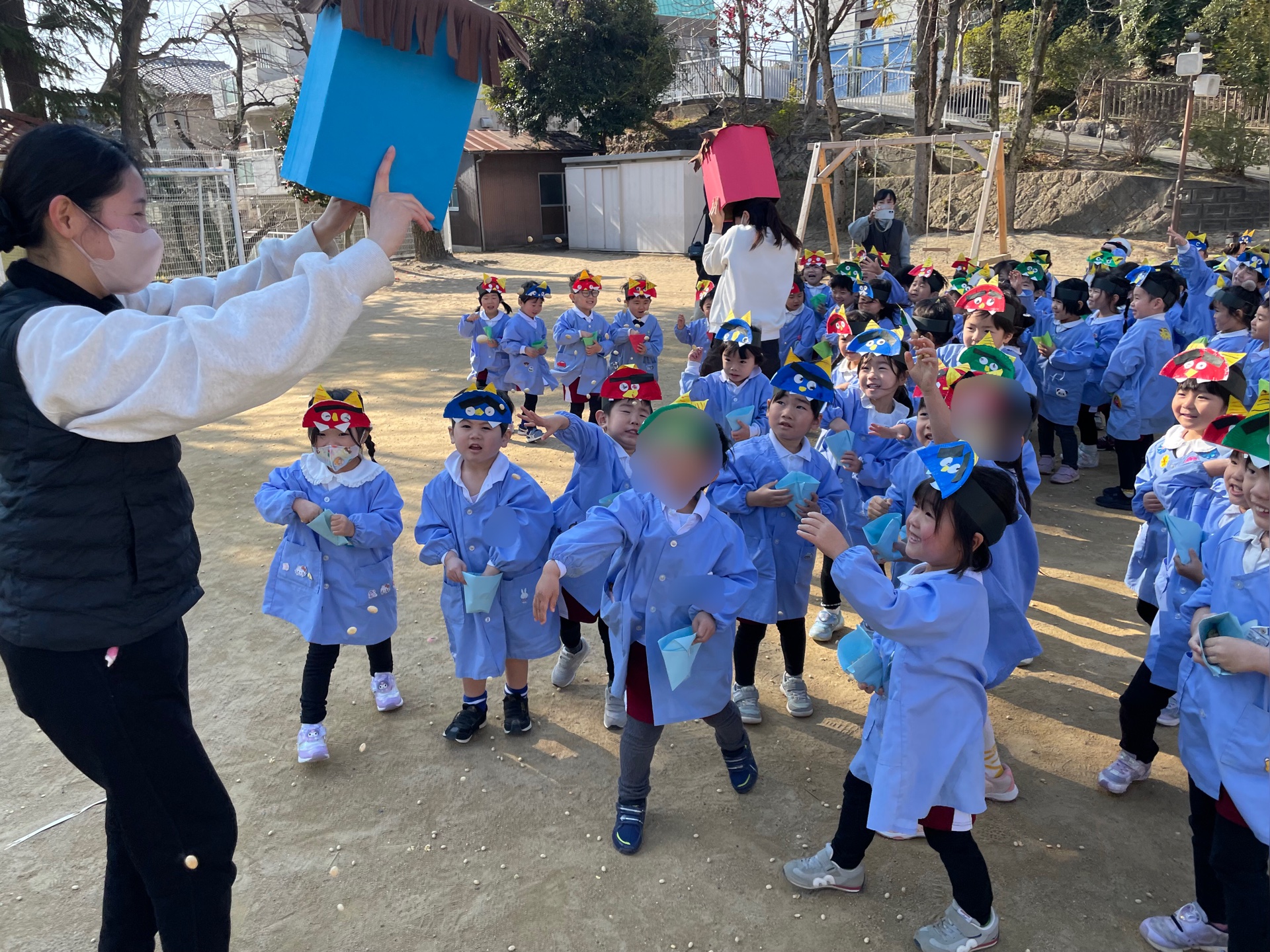 みんなで鬼のお面を被り、豆を持って園庭に出て豆まき対決!