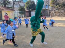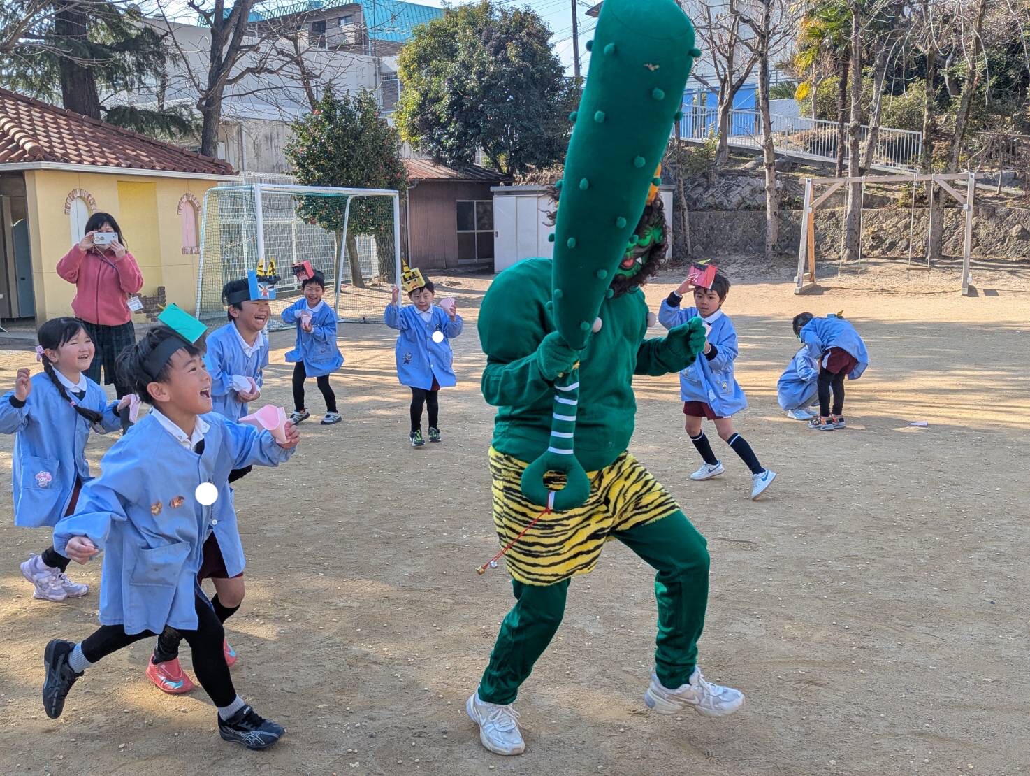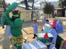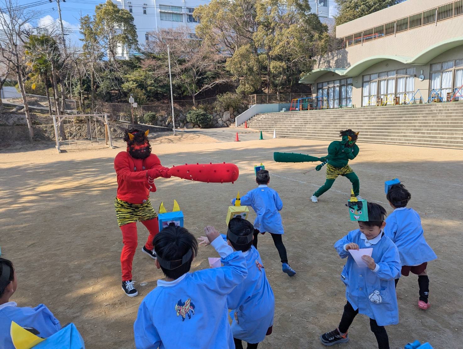 年中・年長さんは、金棒を持った赤鬼・緑鬼が怪獣公園から登場!