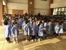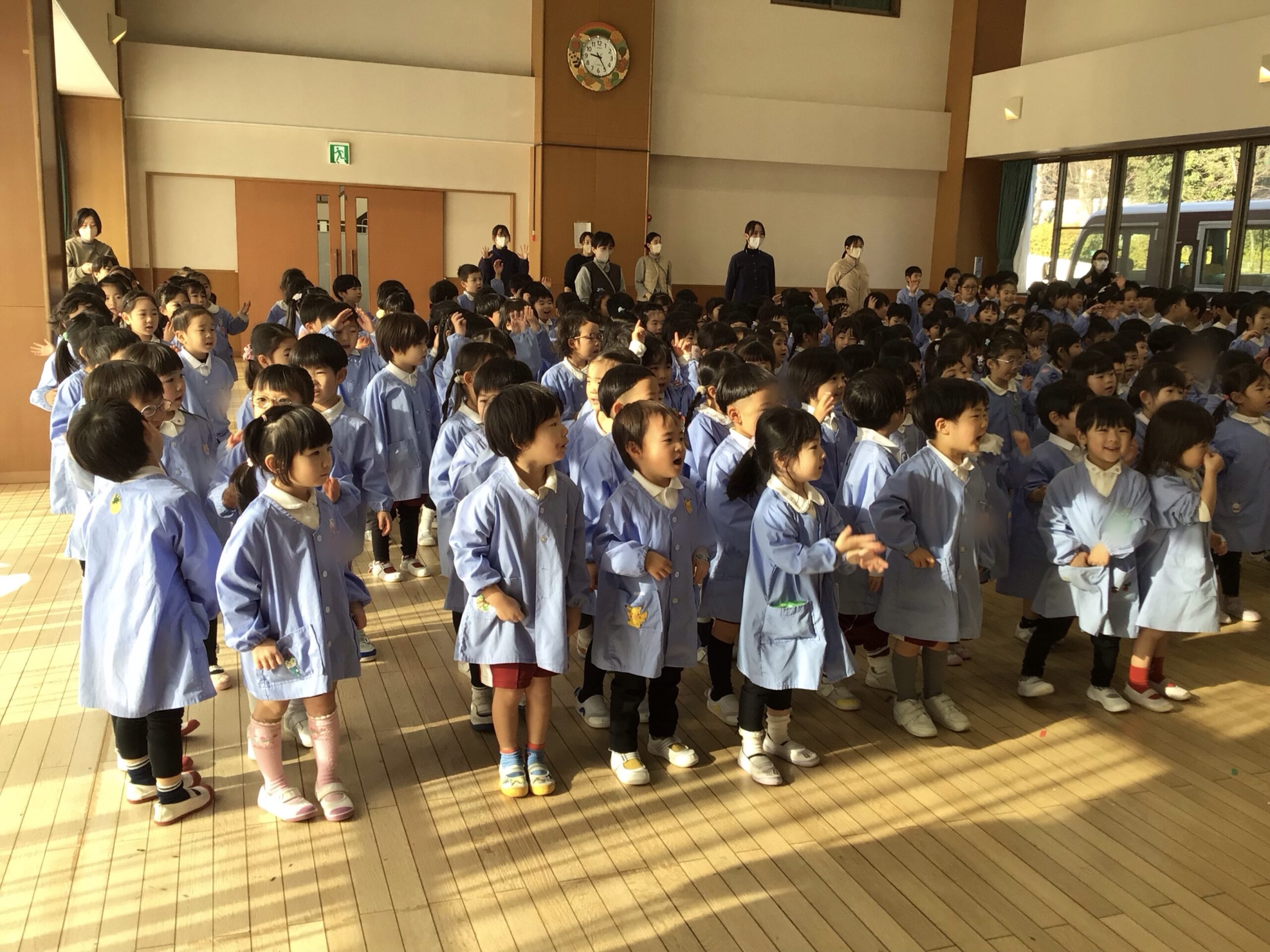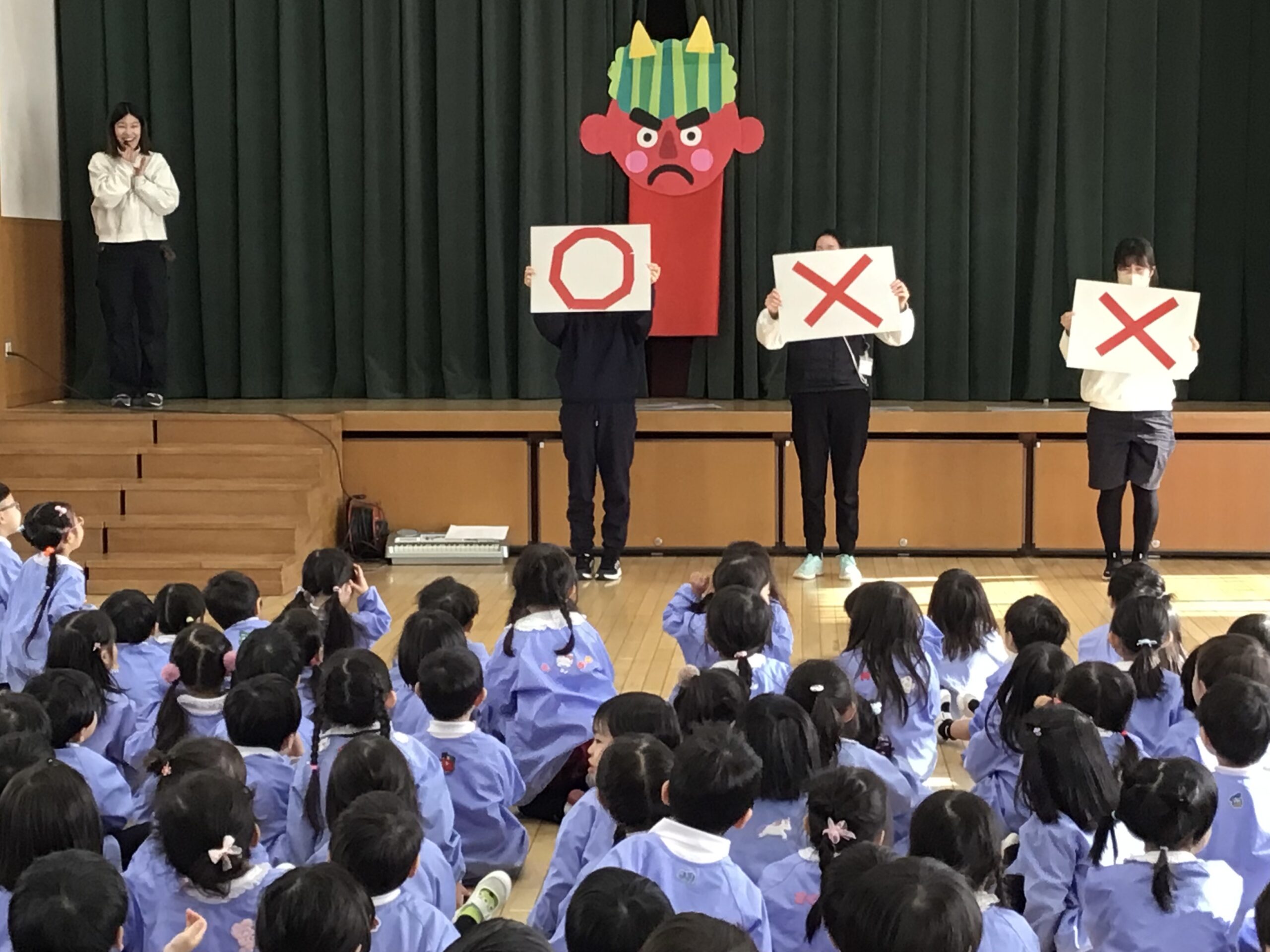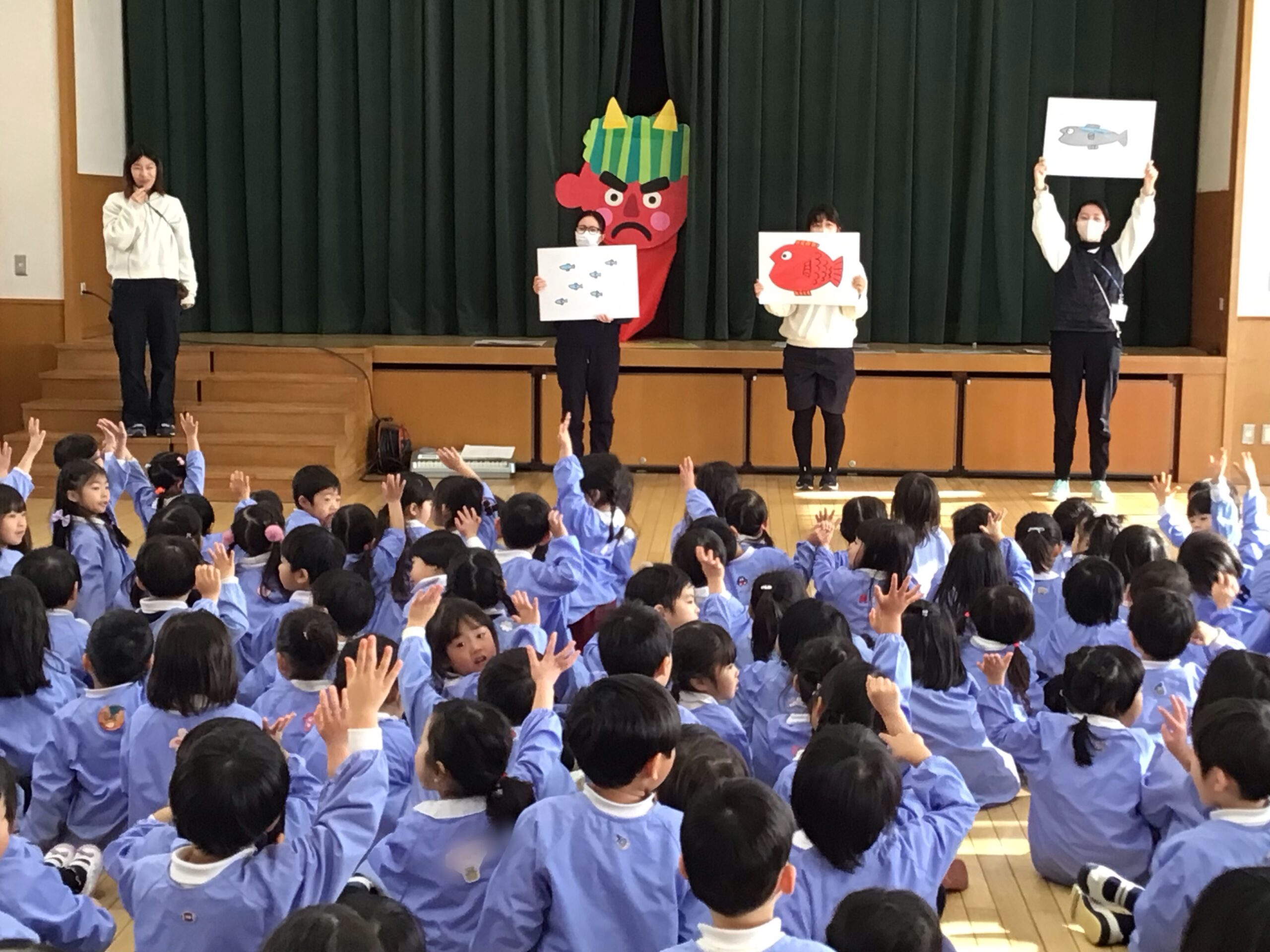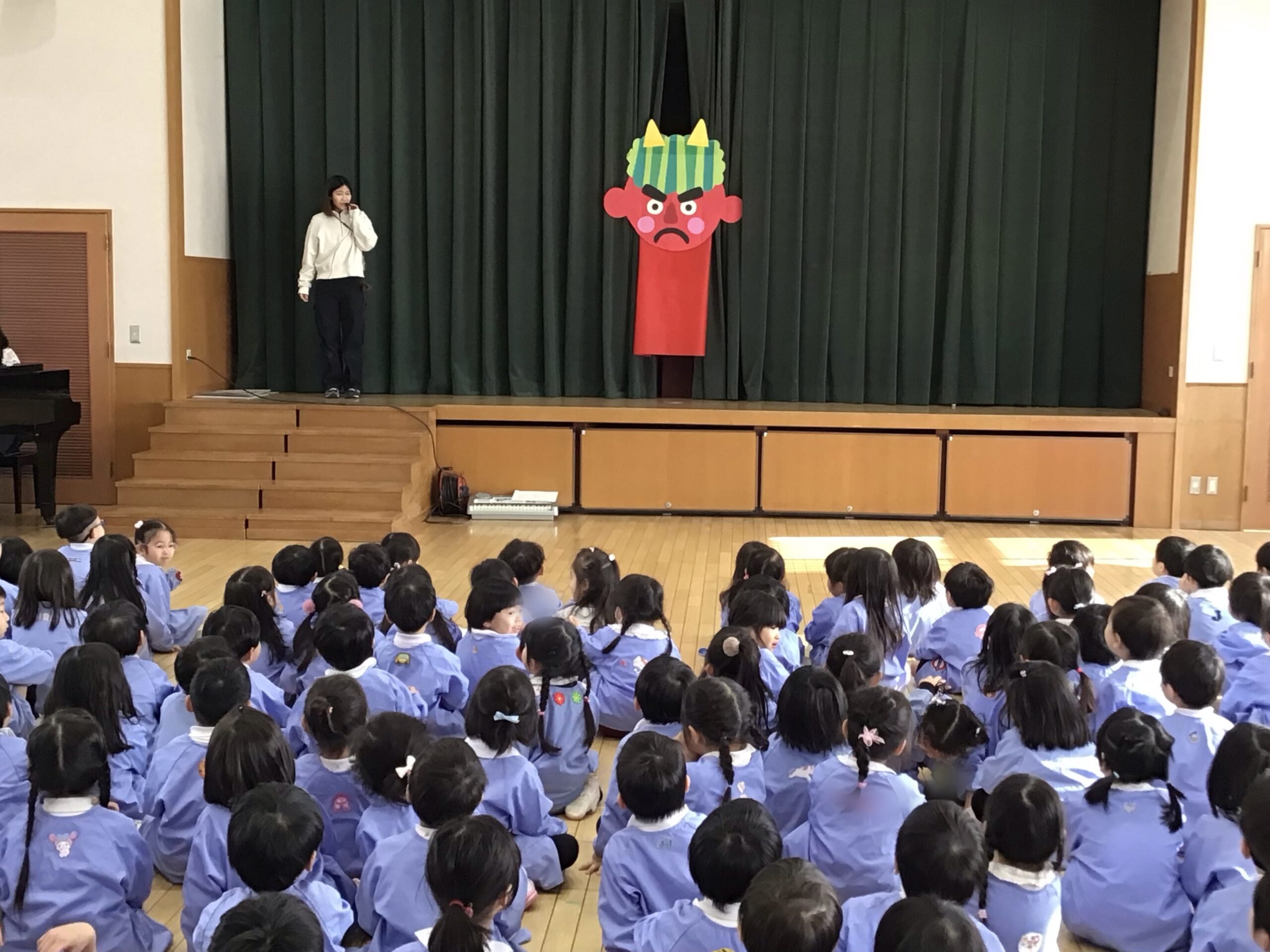 まずは、みんなでホールに集まったんだ。手遊び「鬼のパンツ」や「豆まき」の歌を歌ったんだ。