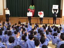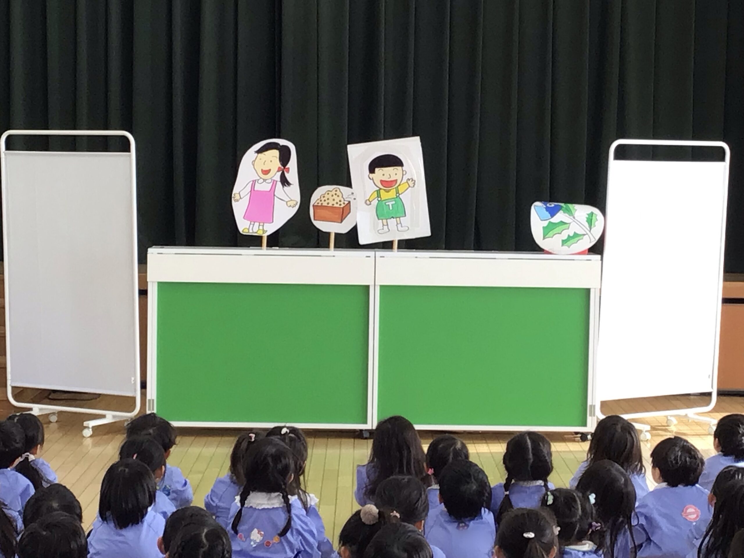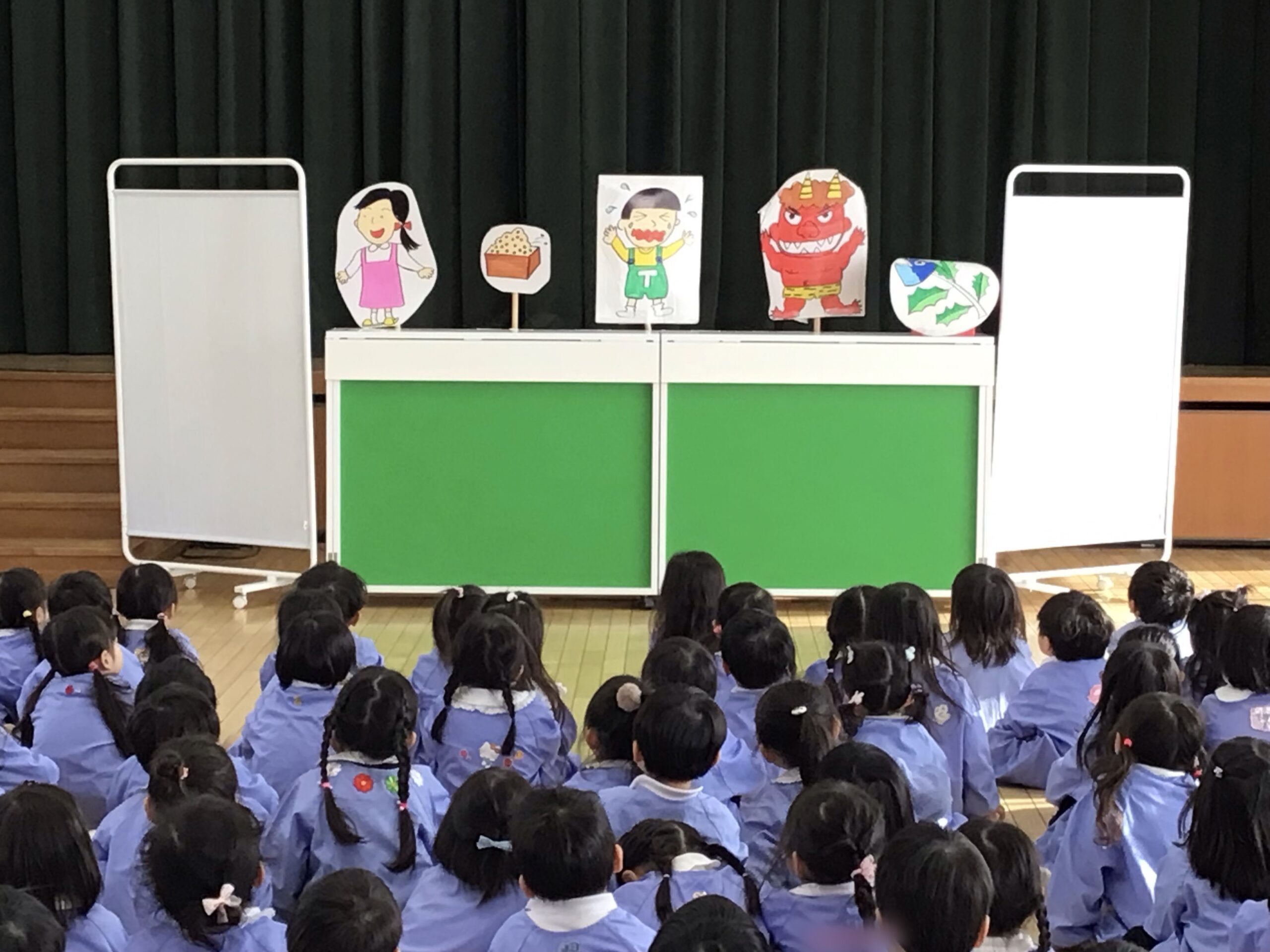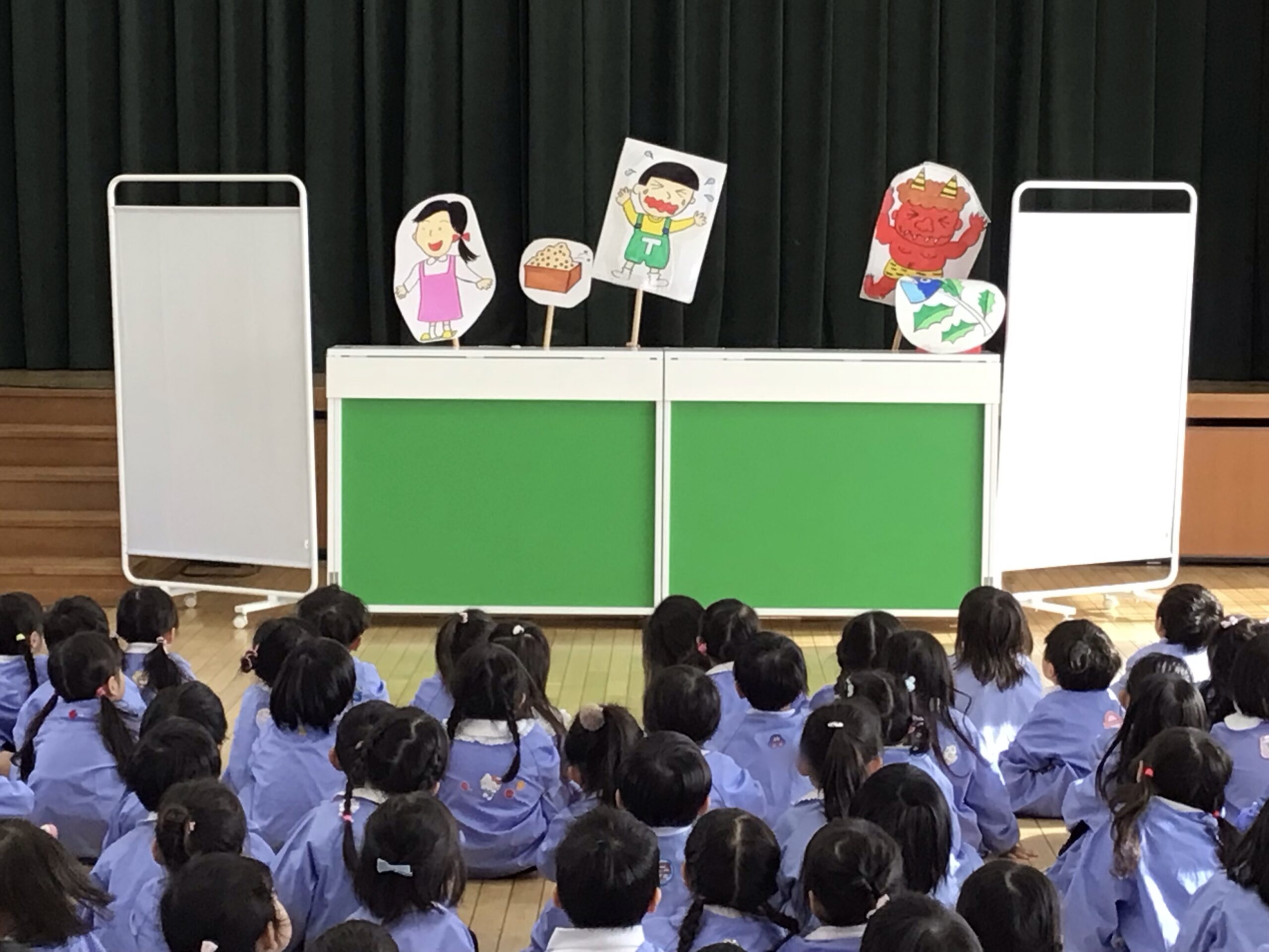 次に、ペープサートで「なぜ豆まきをするのか」のお話を見たよ。鬼の苦手な物もわかったよ!