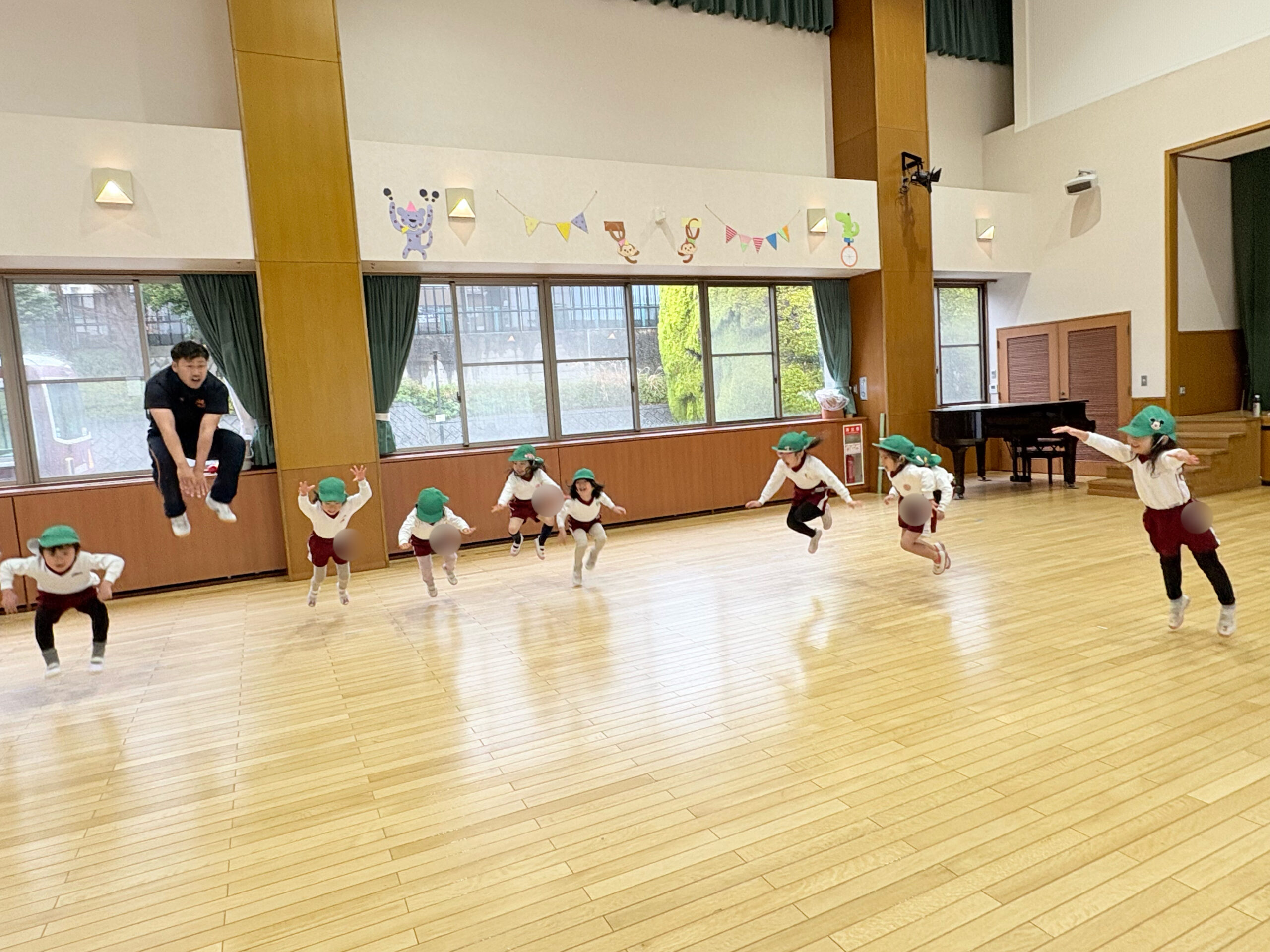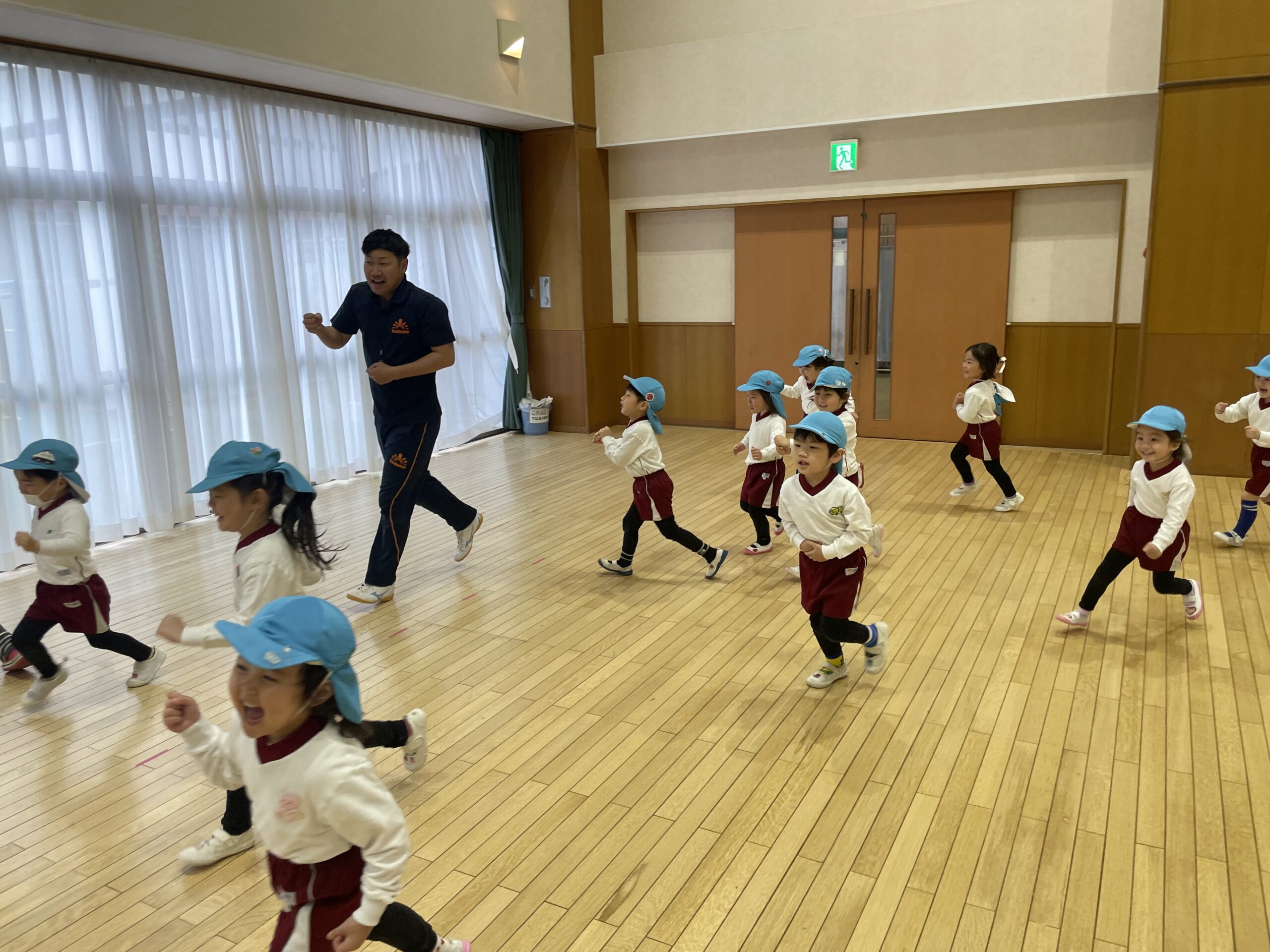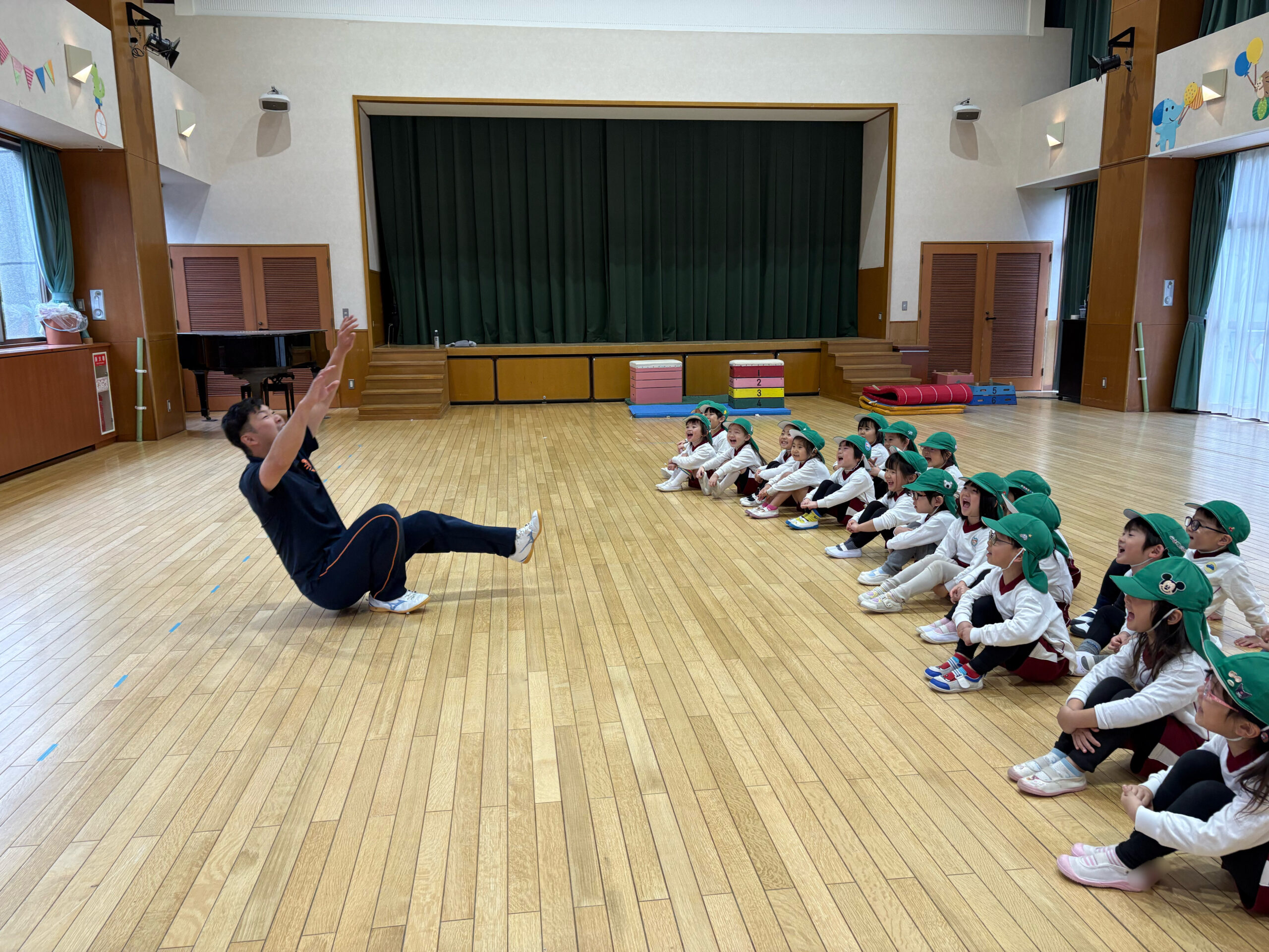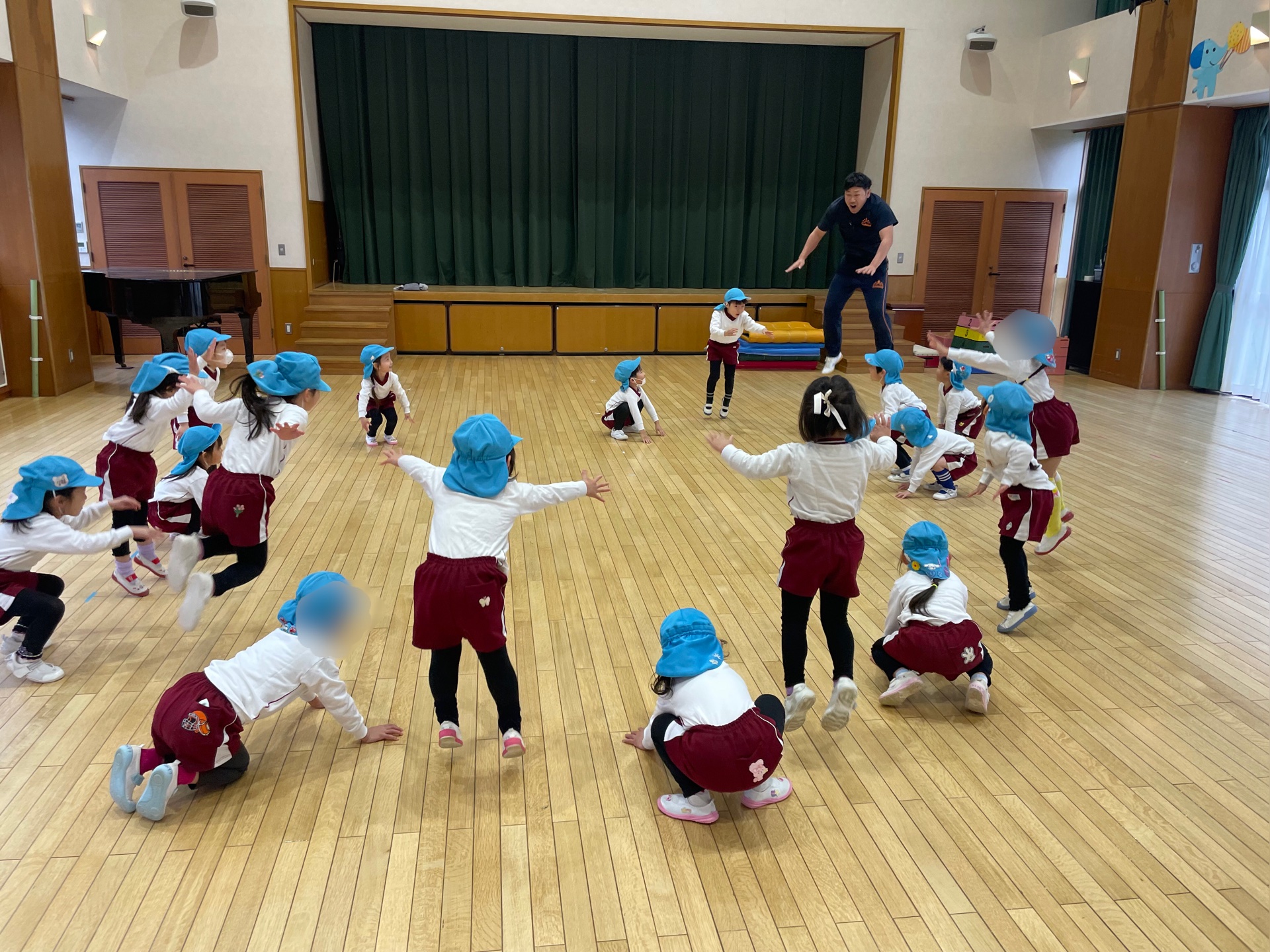 今日は体育の先生が来てくれて、みんなで体をいっぱい動かしたよ(^_-)-☆