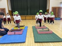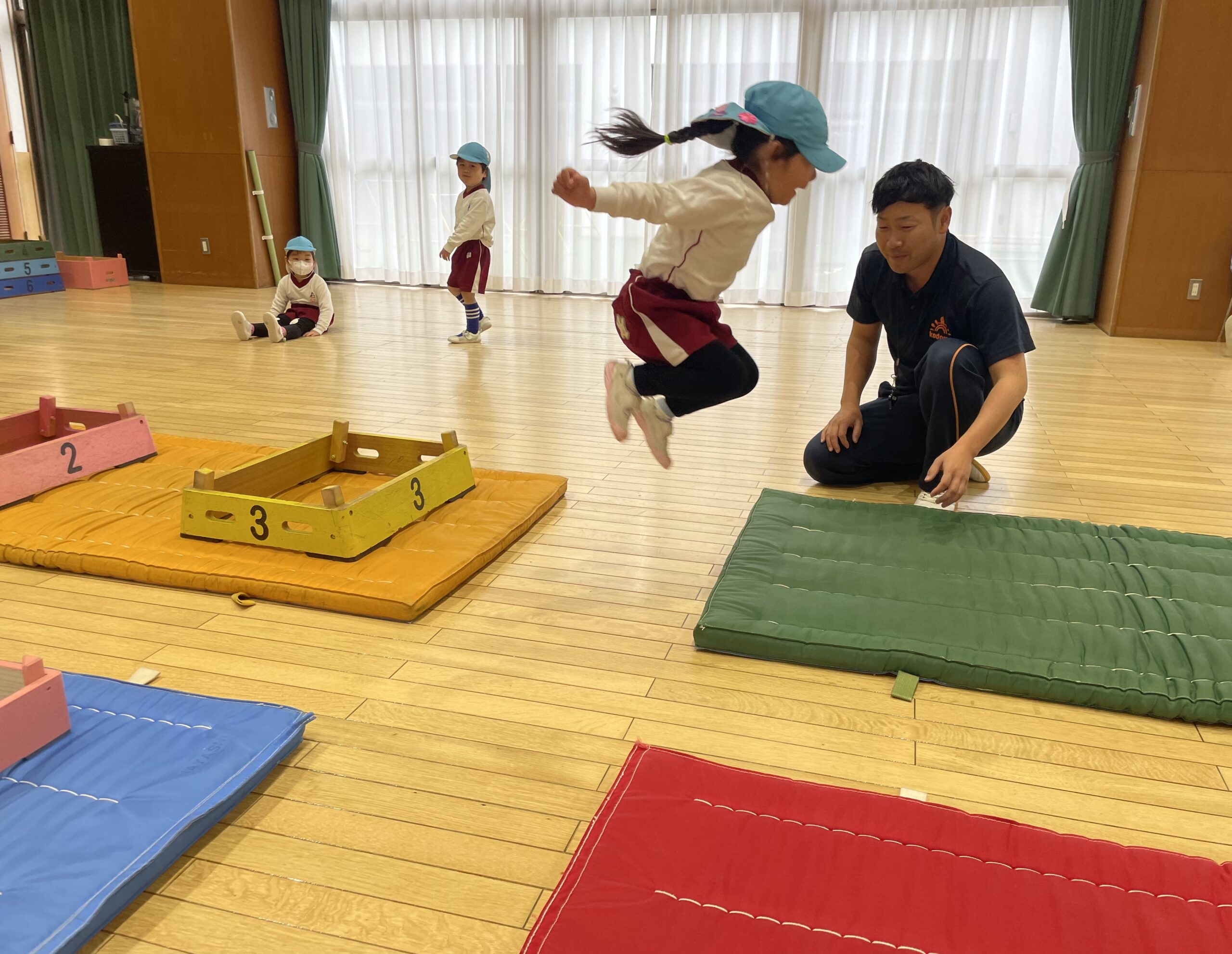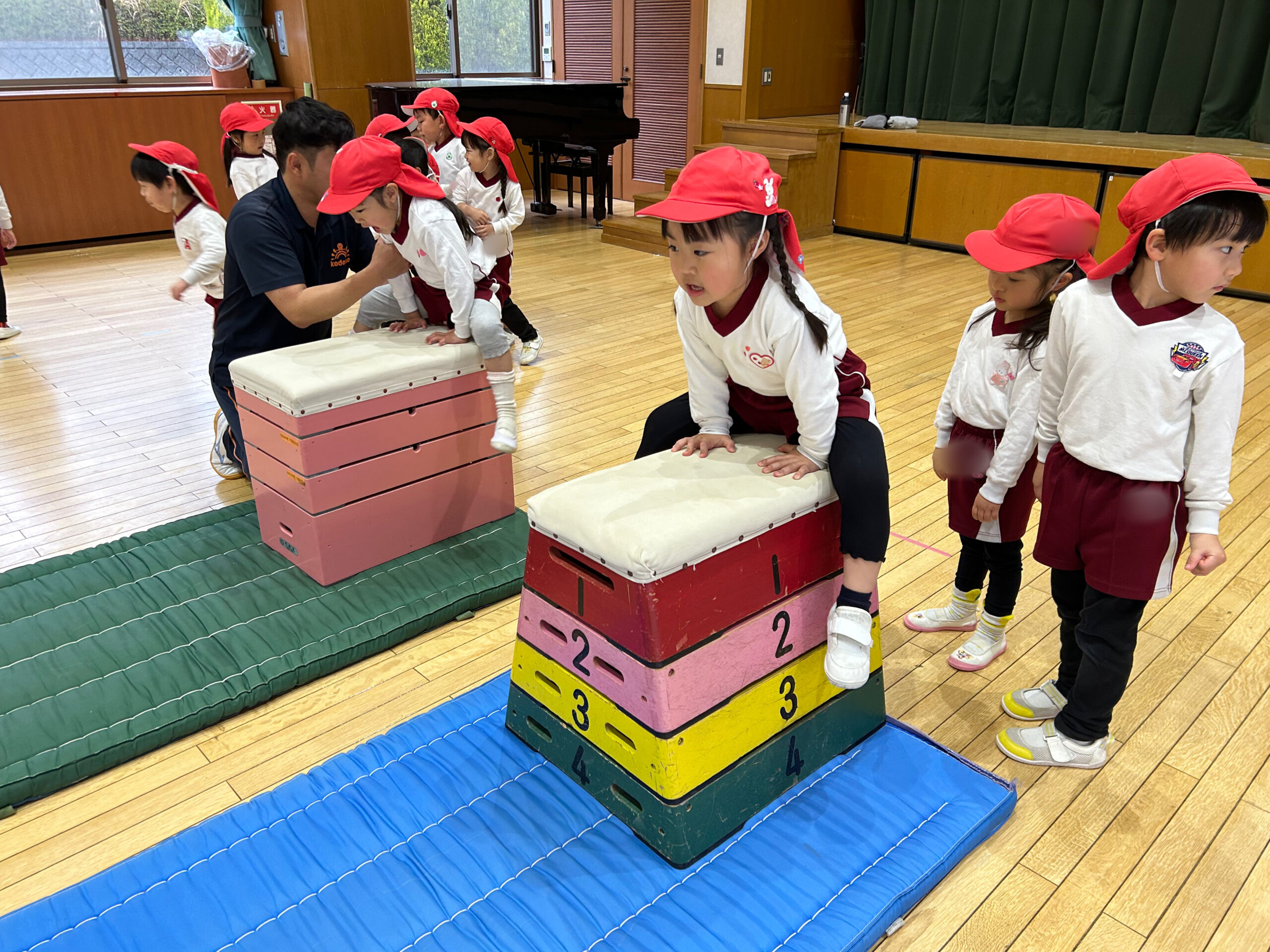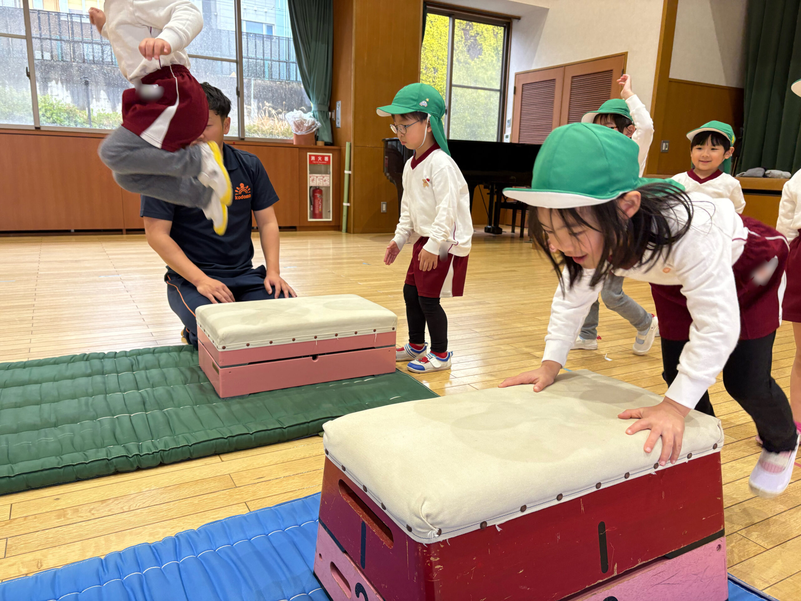 跳び箱を跨いで、マットとマットの間をジャンプ!落ちないようにピョーンと飛ぶよ!