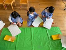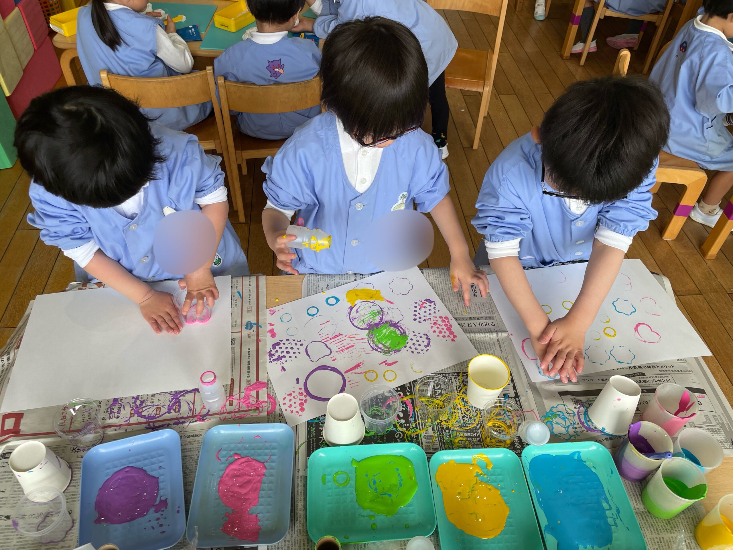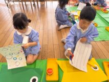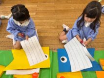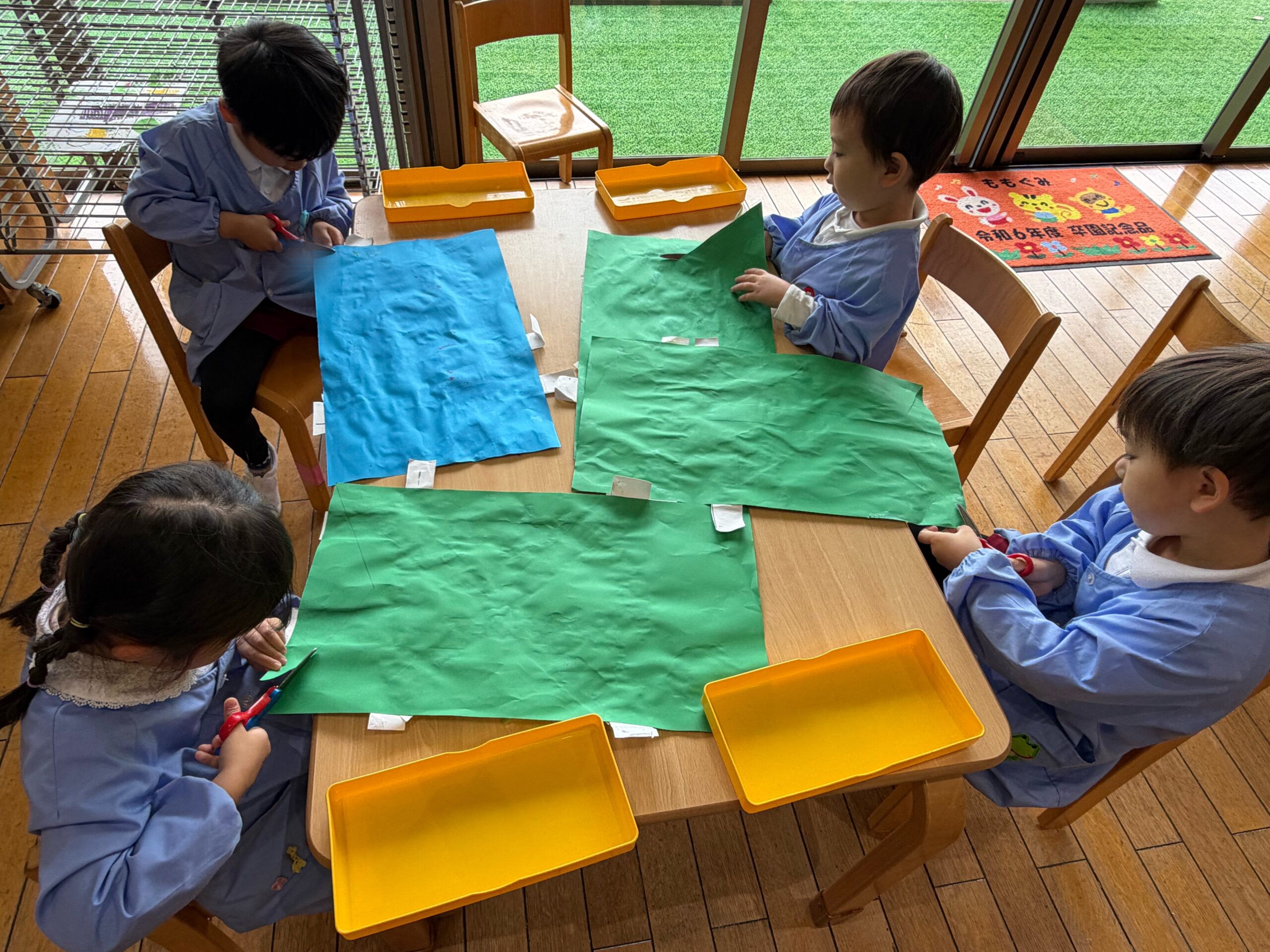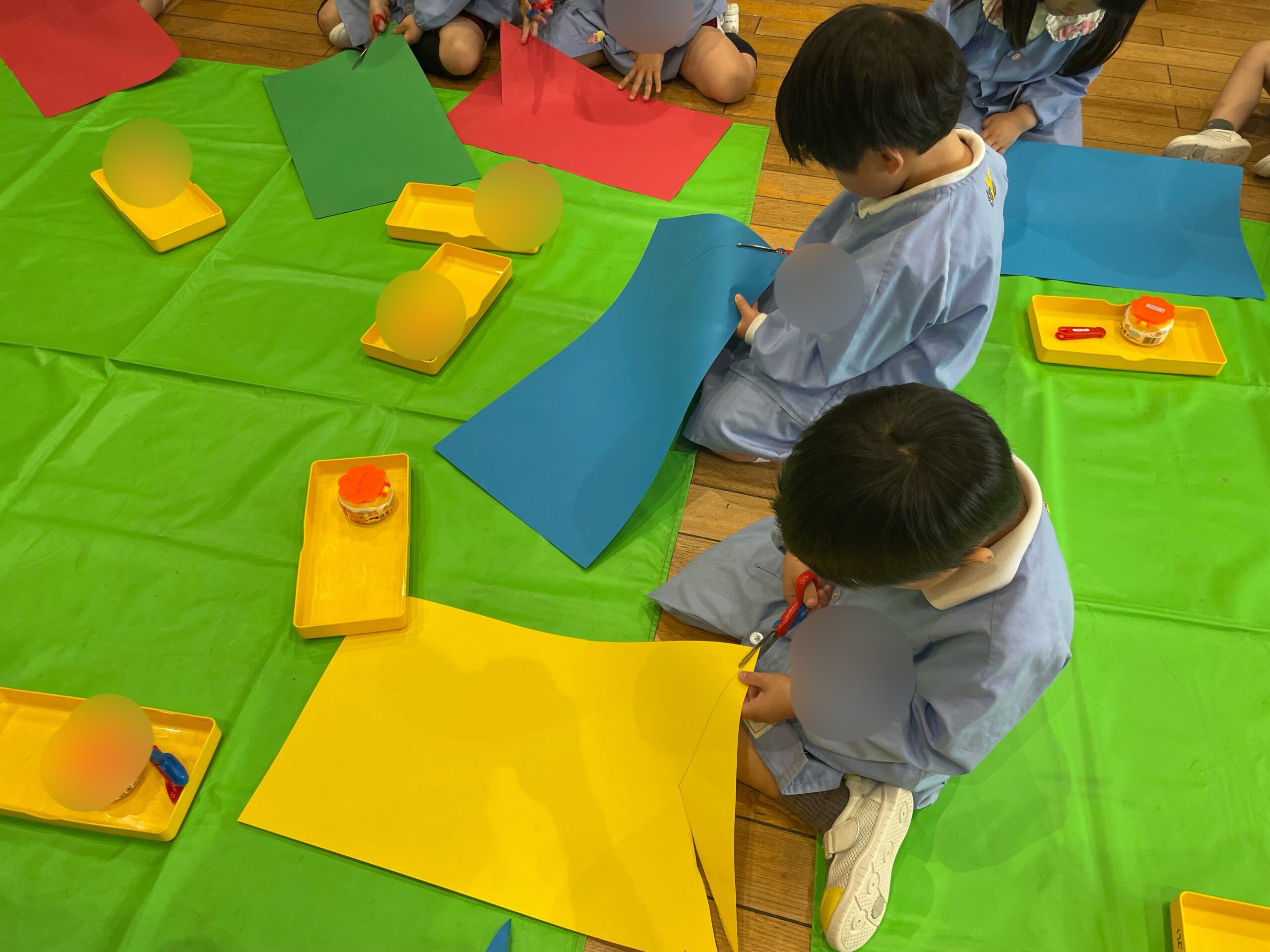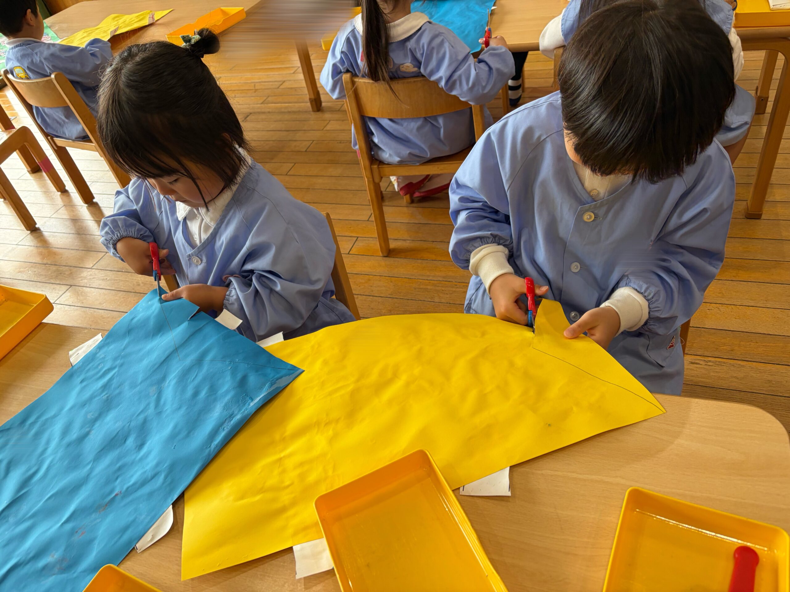 模様を付けた画用紙を縦に切って、こいのぼりに貼るんだ!斜めにしたり、バツにしたり、自分で考えて貼るよ~(*^_^*)