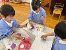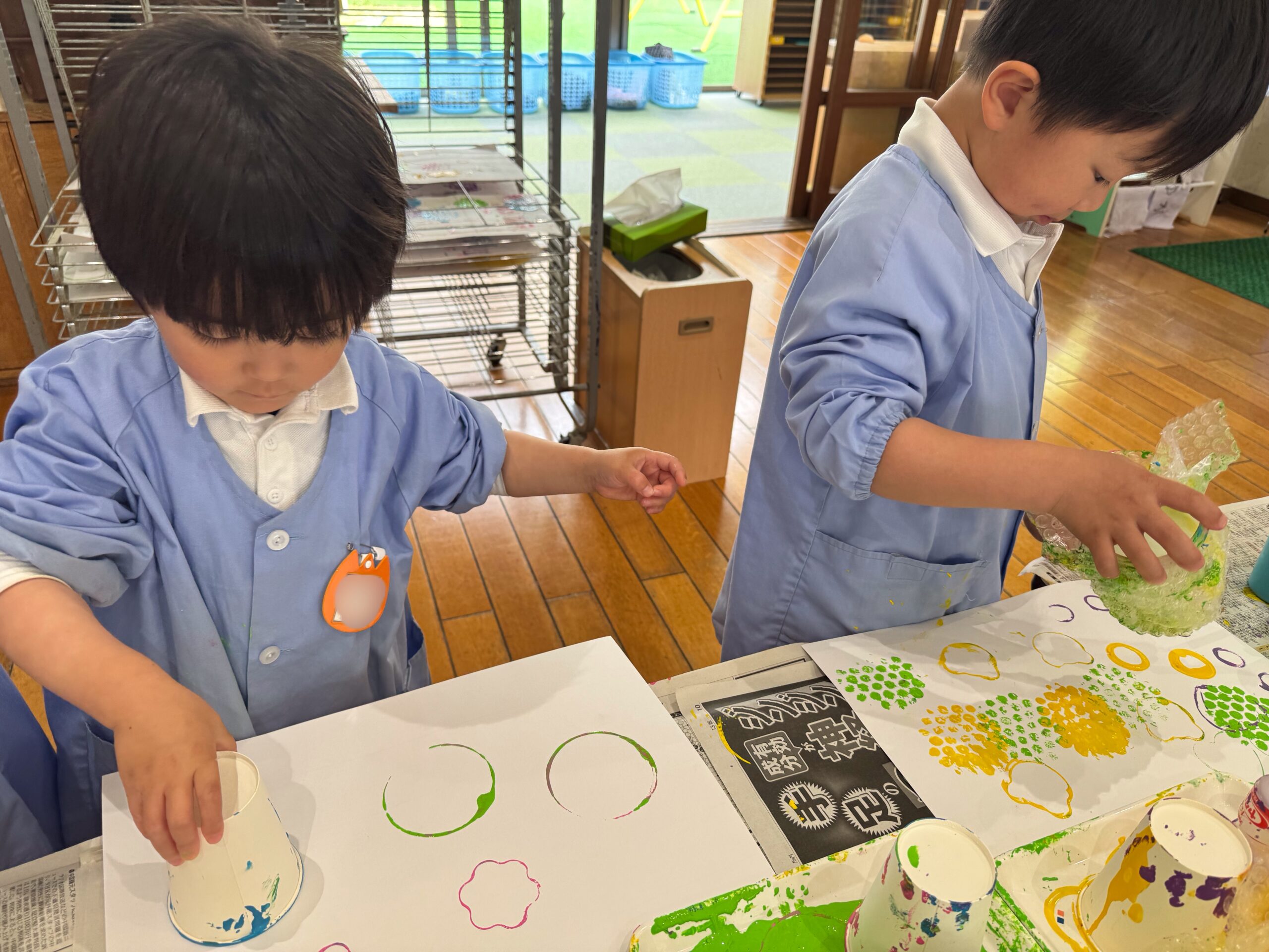 白色の画用紙に、いろんな形の型やギザギザ厚紙で模様をつけるよ!素敵な模様で~きたっ☆